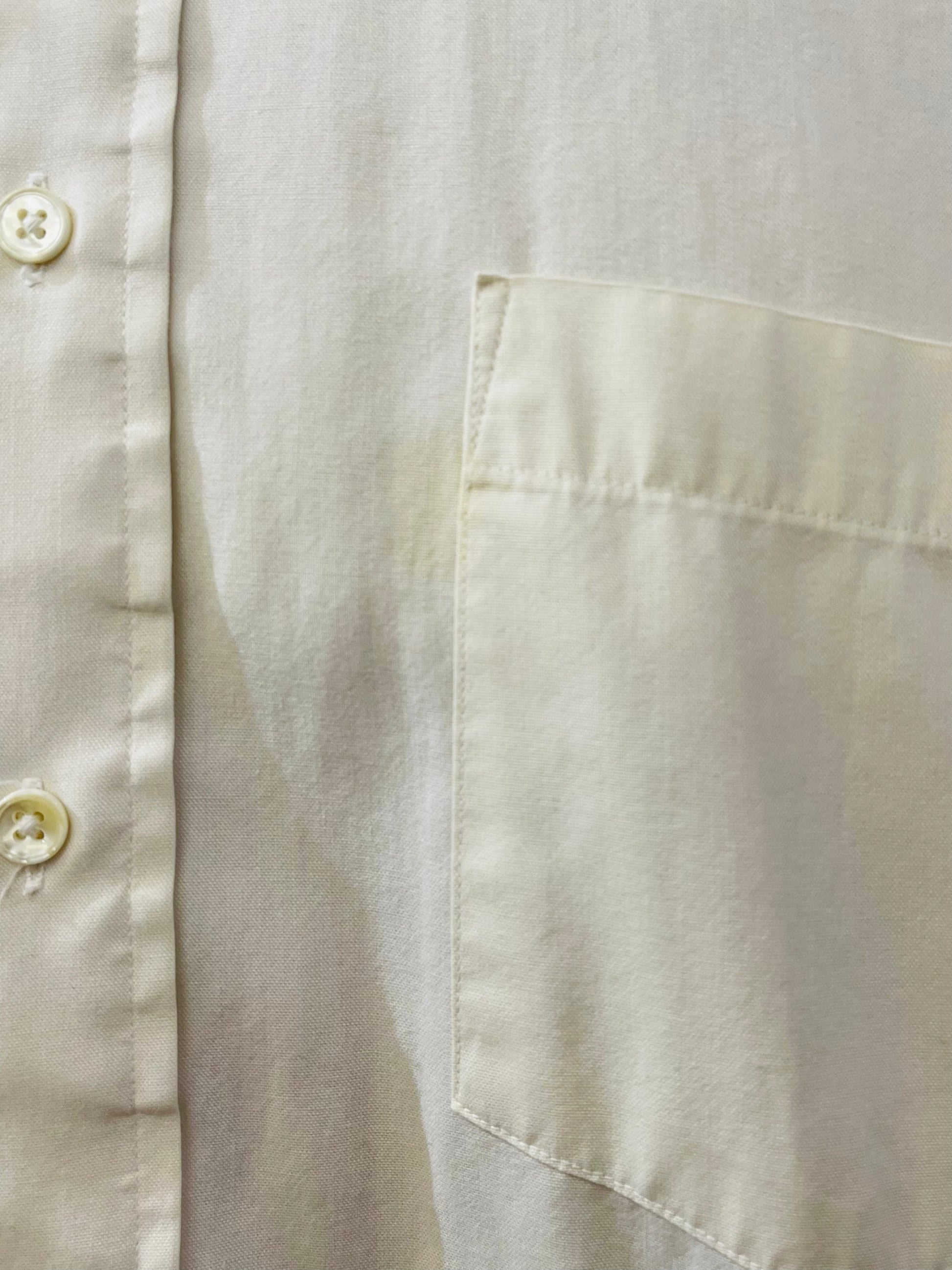 This Pima Pinpoint Long Sleeve Shirt features a classic off-white color and is proudly made in the USA. Despite a small discoloration near the pocket, this shirt maintains its durable and versatile style, making it a timeless addition to any wardrobe.