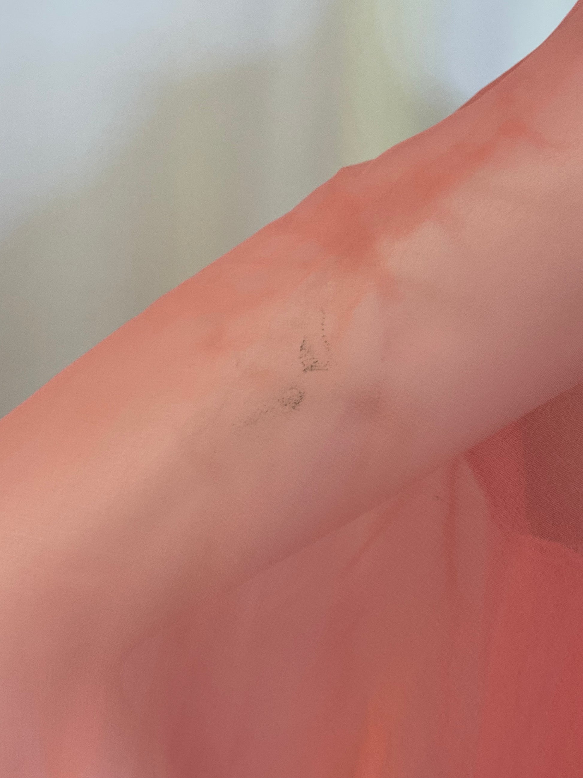 This is a fantastic vibrant salmon pink full length gown with flowing chiffon sleeves and amazing beading at the neckline! Other than a small mark on one sleeve, this dress is in amazing condition! Best part? It’s in Volup sizing!