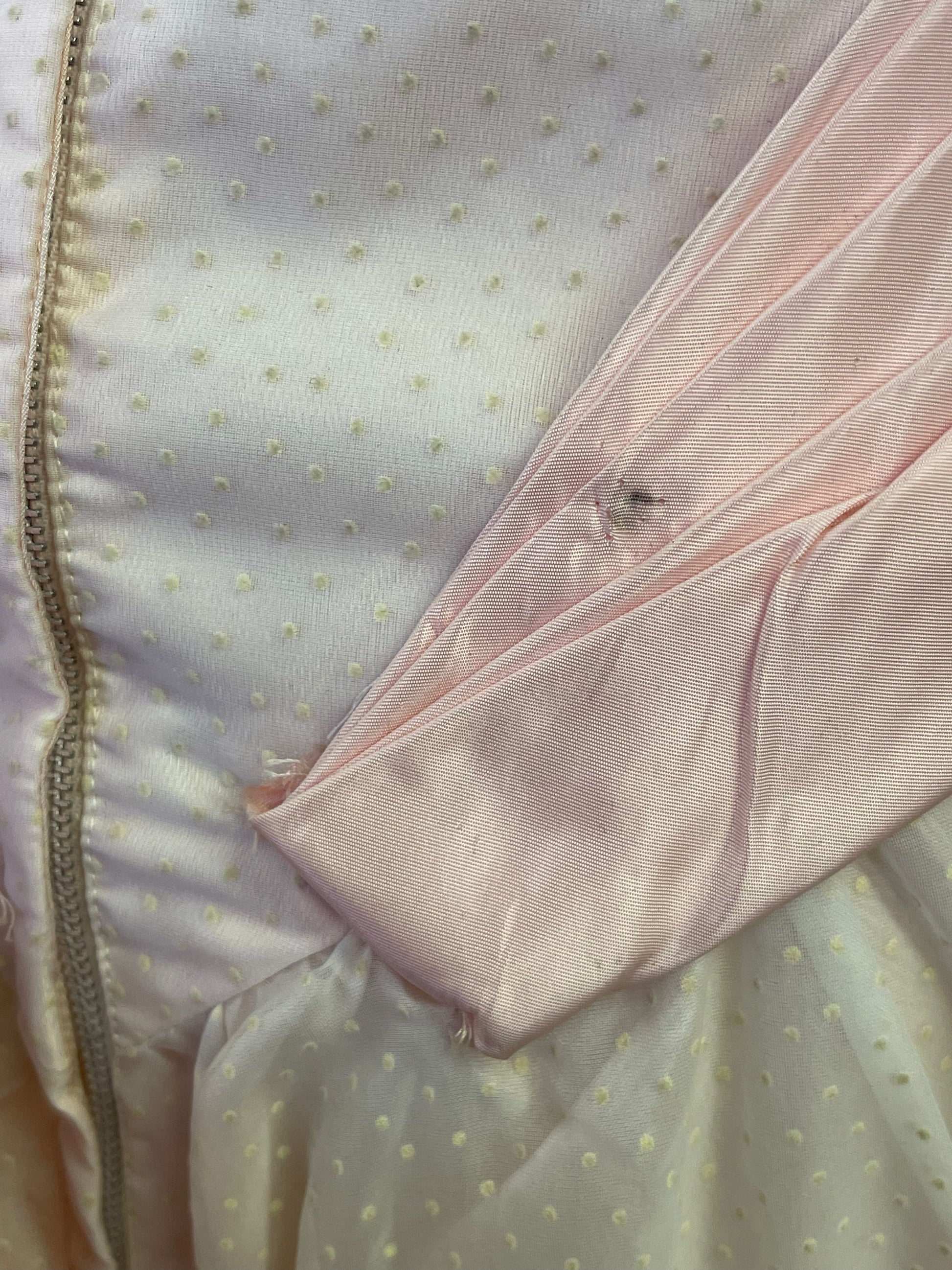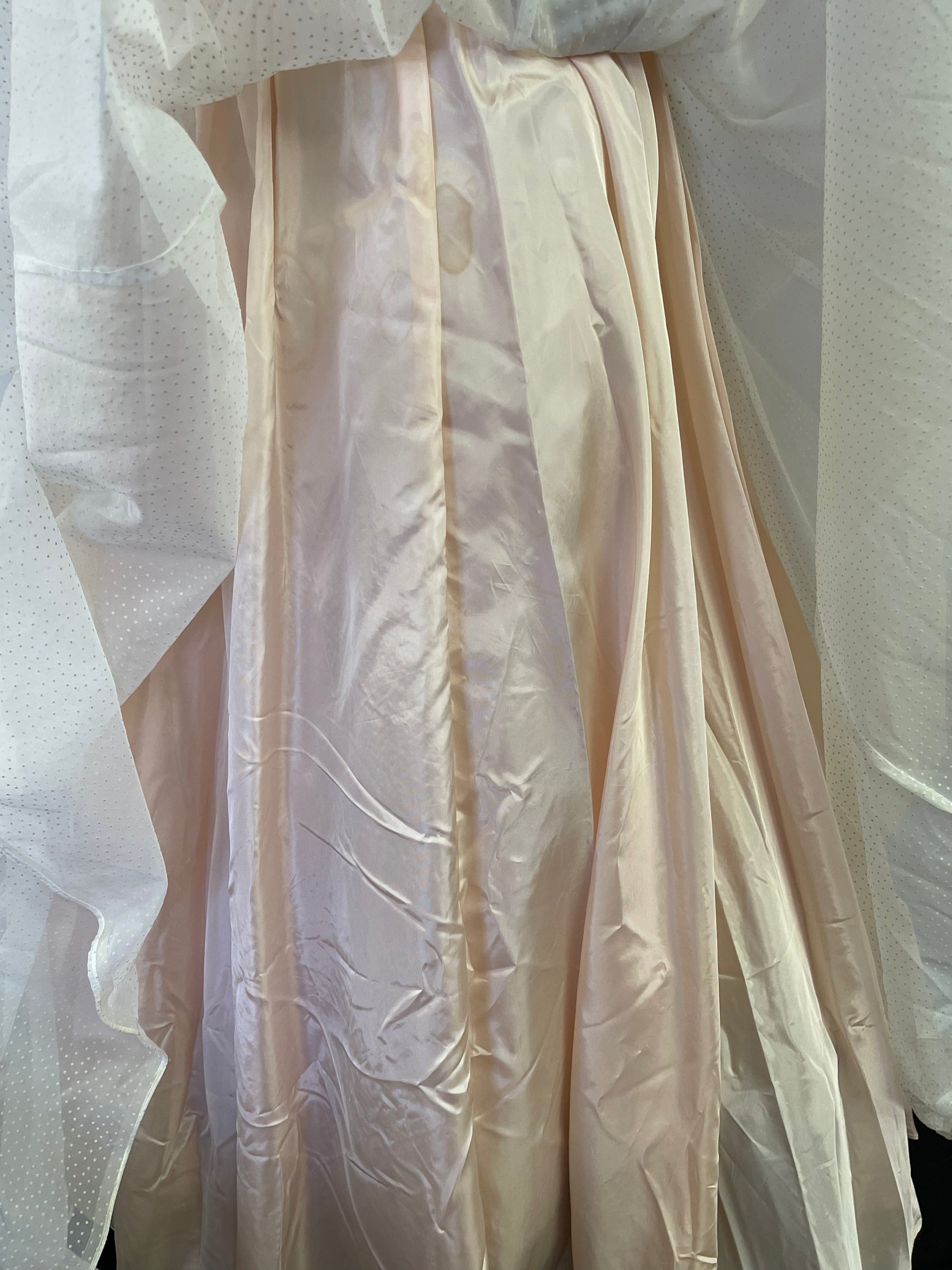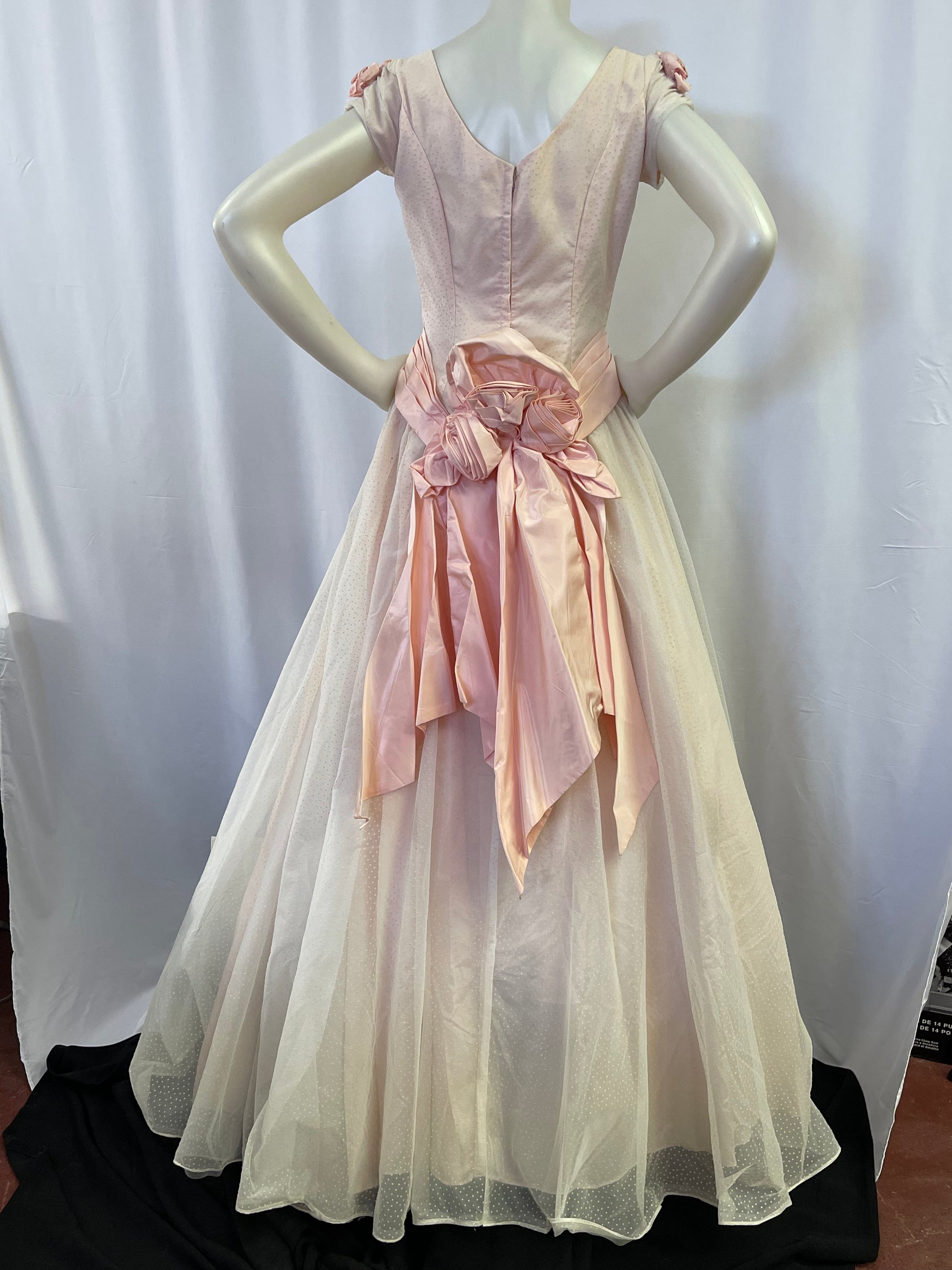 Simply amazing 50s formal gown. The top layer is made of the palest of pinks and has a Swiss dot pattern. A pink satin cummerbund pleats at the front of waist and swirls into rose like flowers. The second skirt layer is pink acetate and there is pink tulle under that.