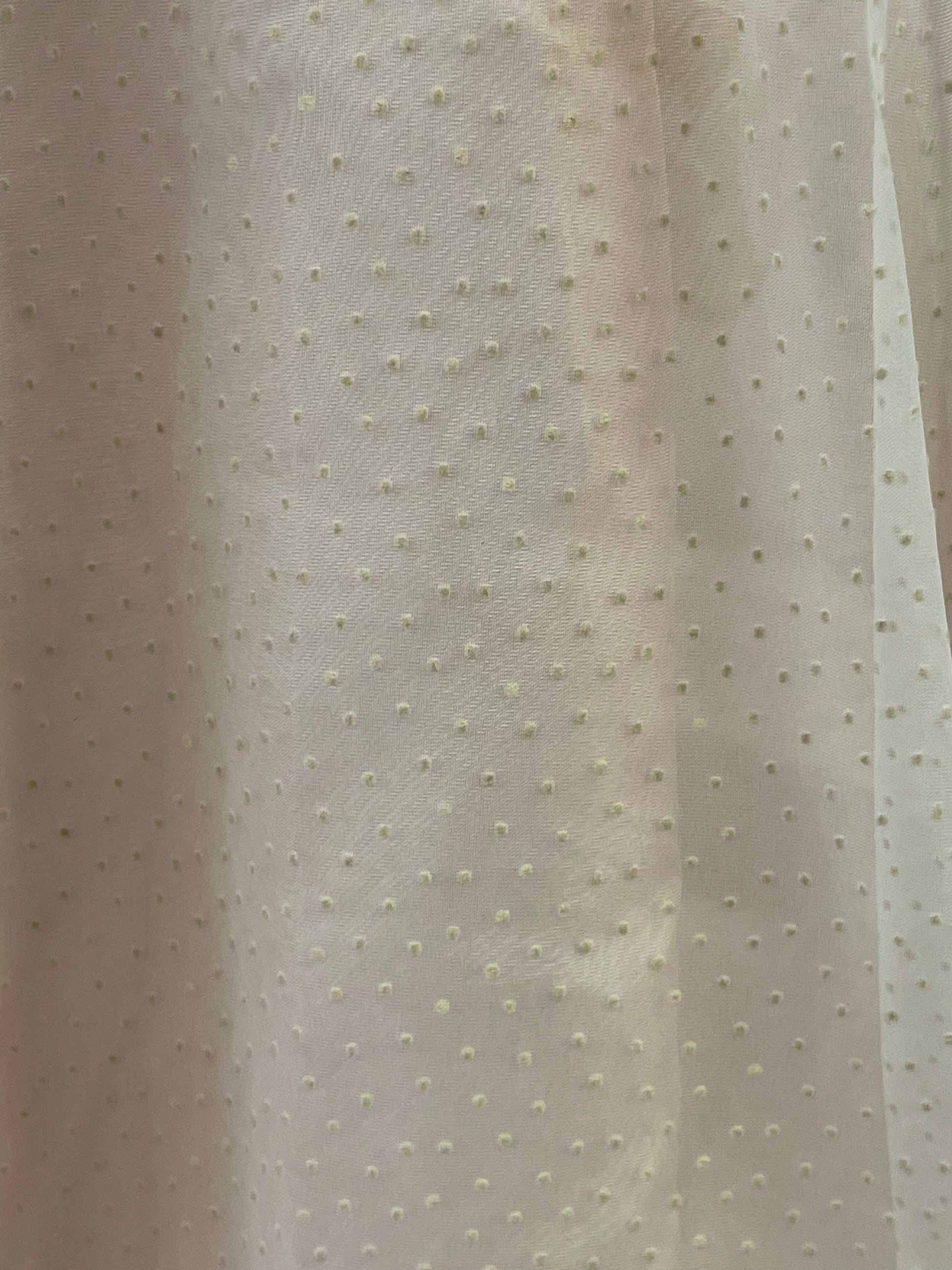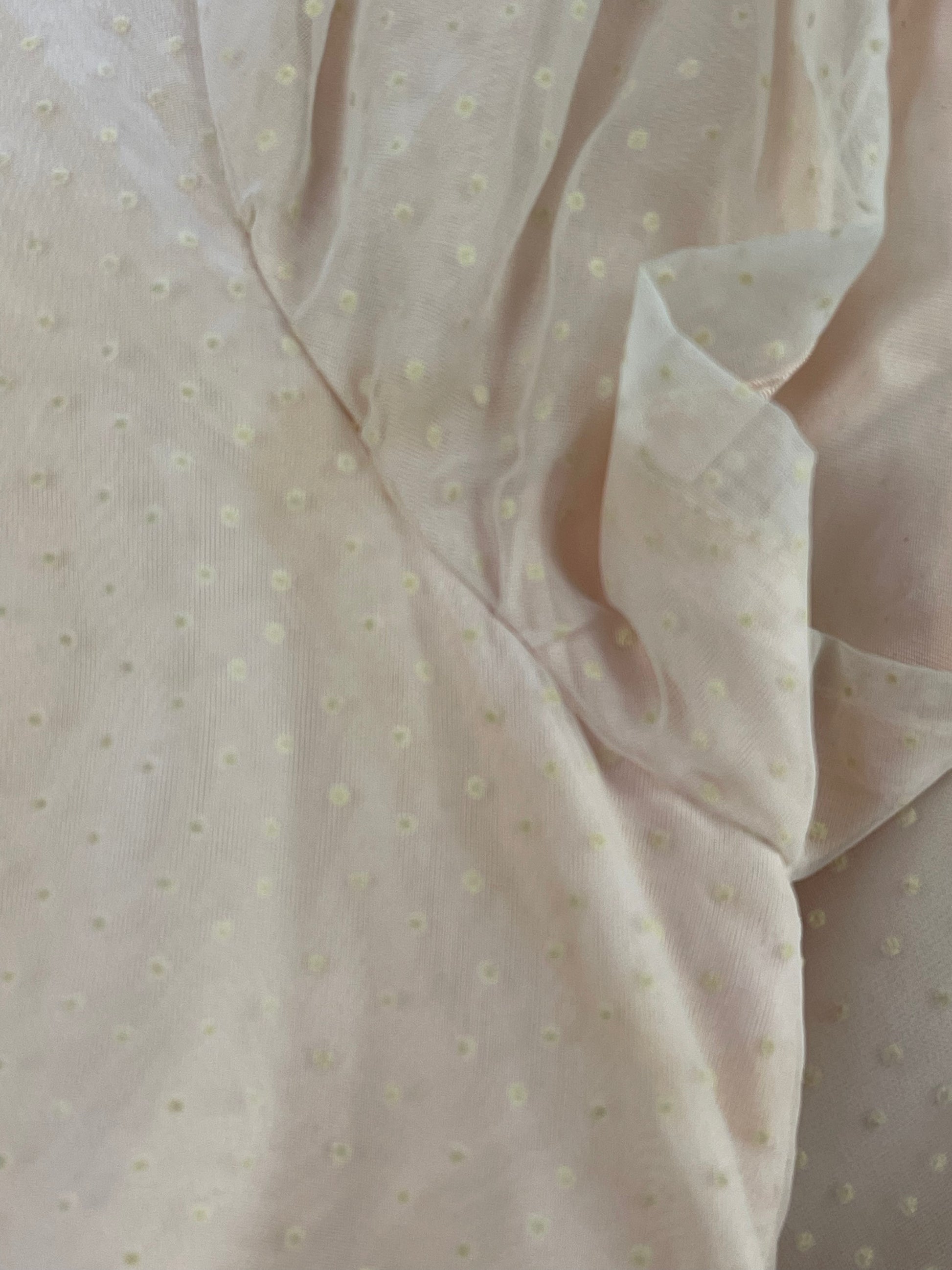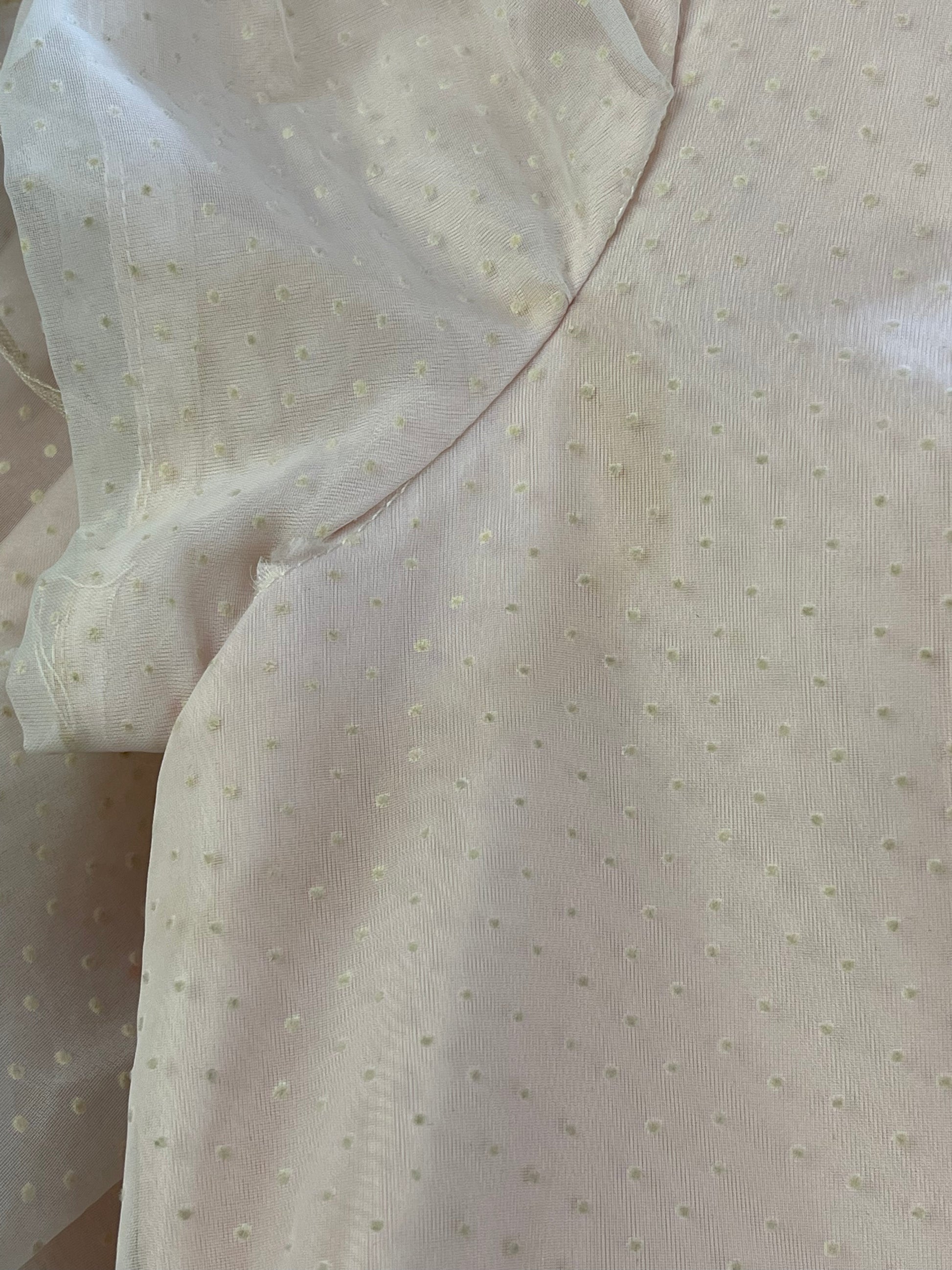 Simply amazing 50s formal gown. The top layer is made of the palest of pinks and has a Swiss dot pattern. A pink satin cummerbund pleats at the front of waist and swirls into rose like flowers. The second skirt layer is pink acetate and there is pink tulle under that.