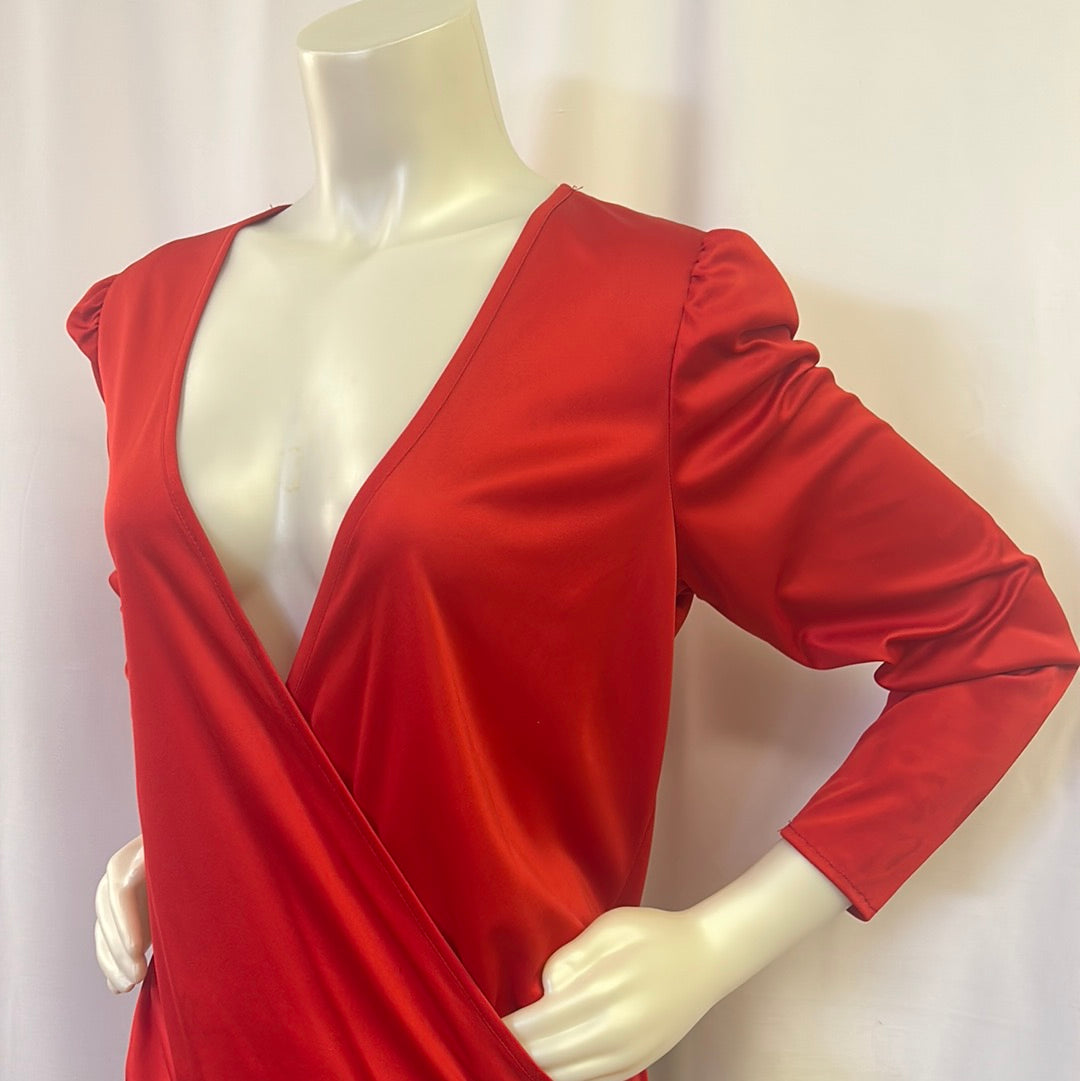 Red and black party dress with low cut V-neckline, and a matching red waist ribbon.