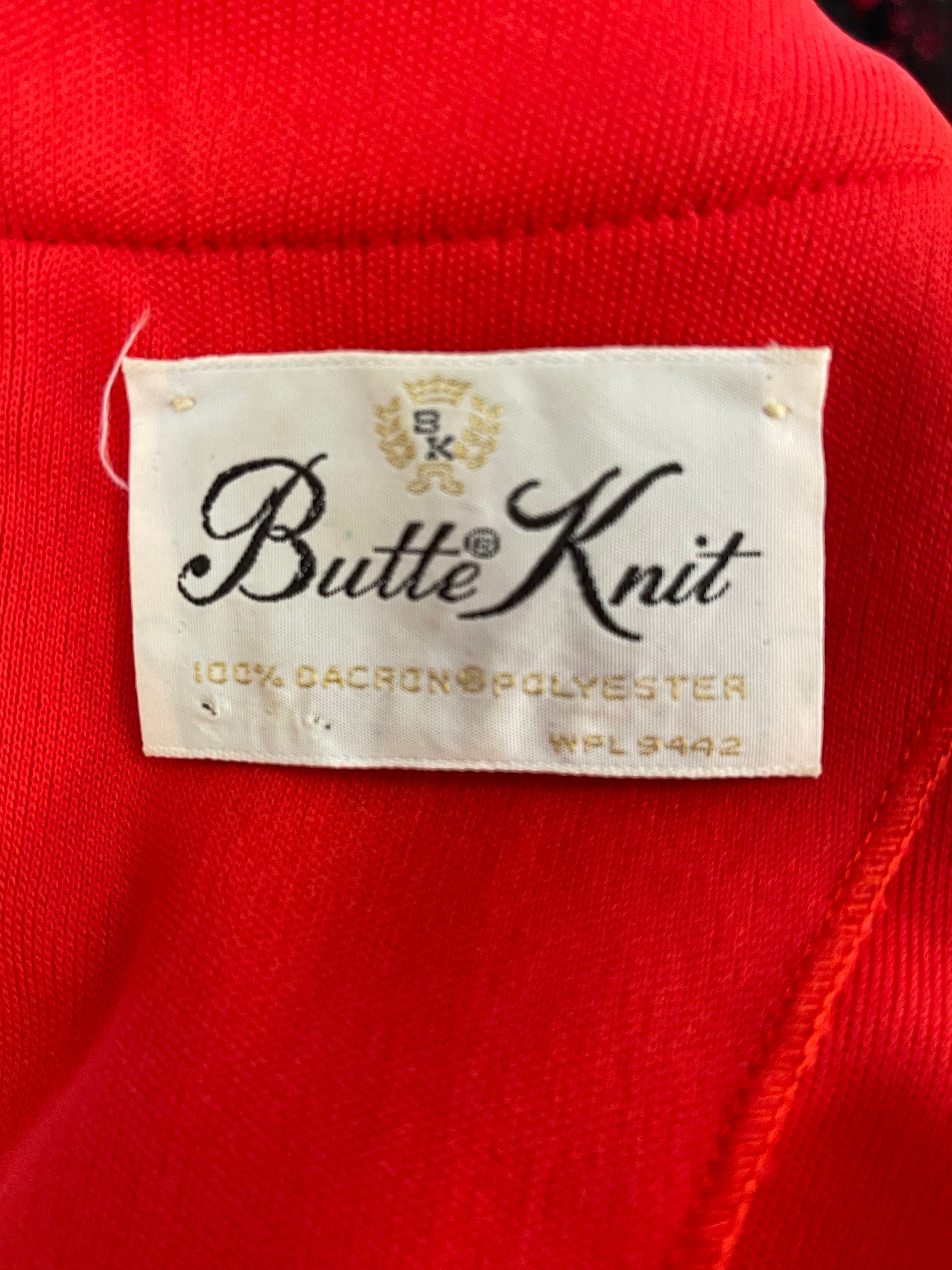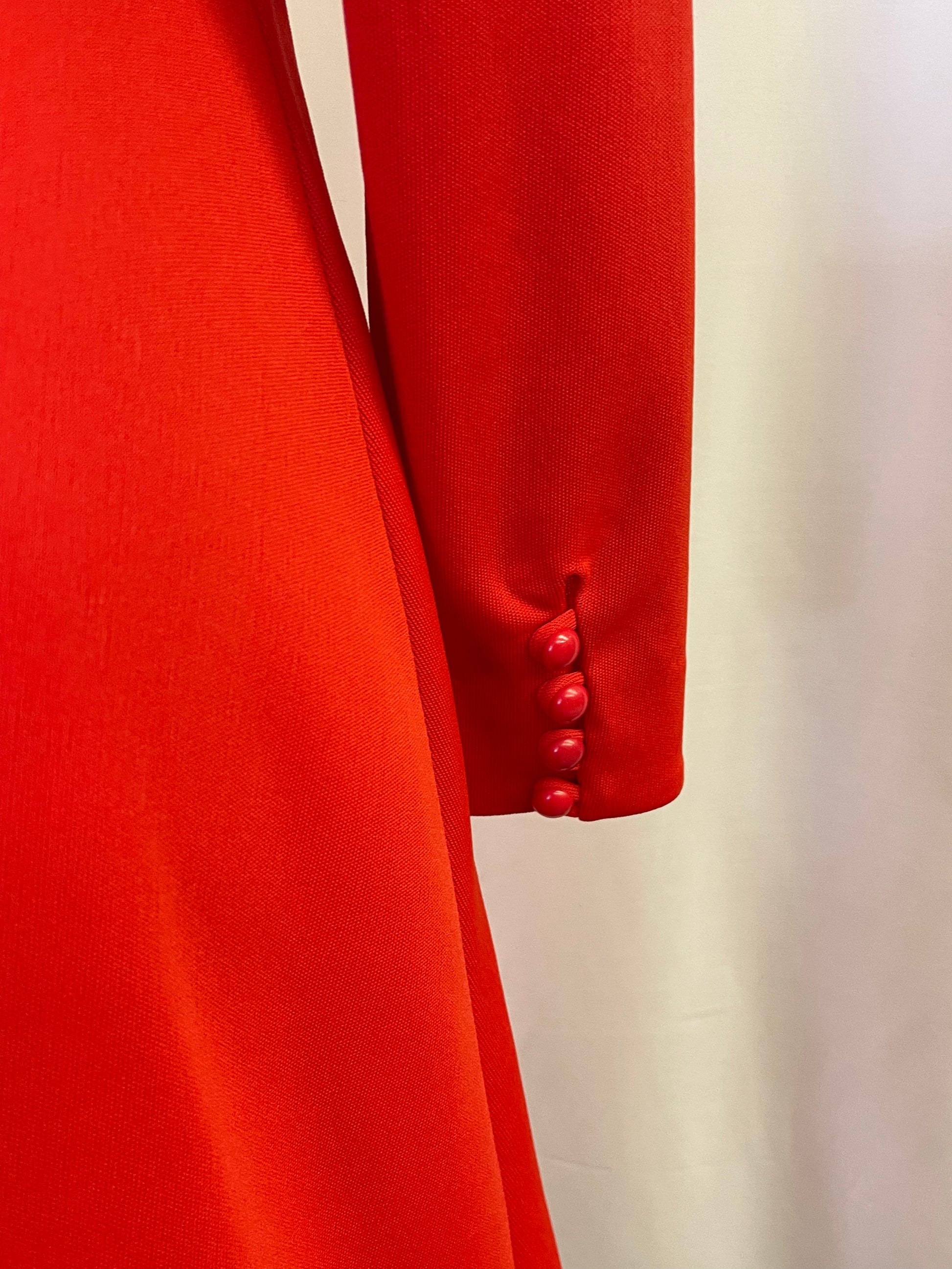 This is a tomato red maxi dress that features a V neck and faux buttons in the front and sleeves. Full back zip and is in excellent condition. Labeled Butte Knit