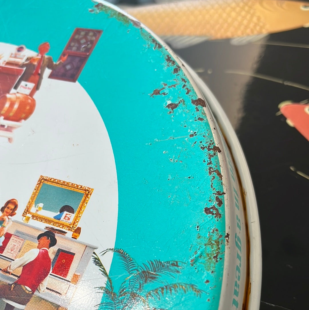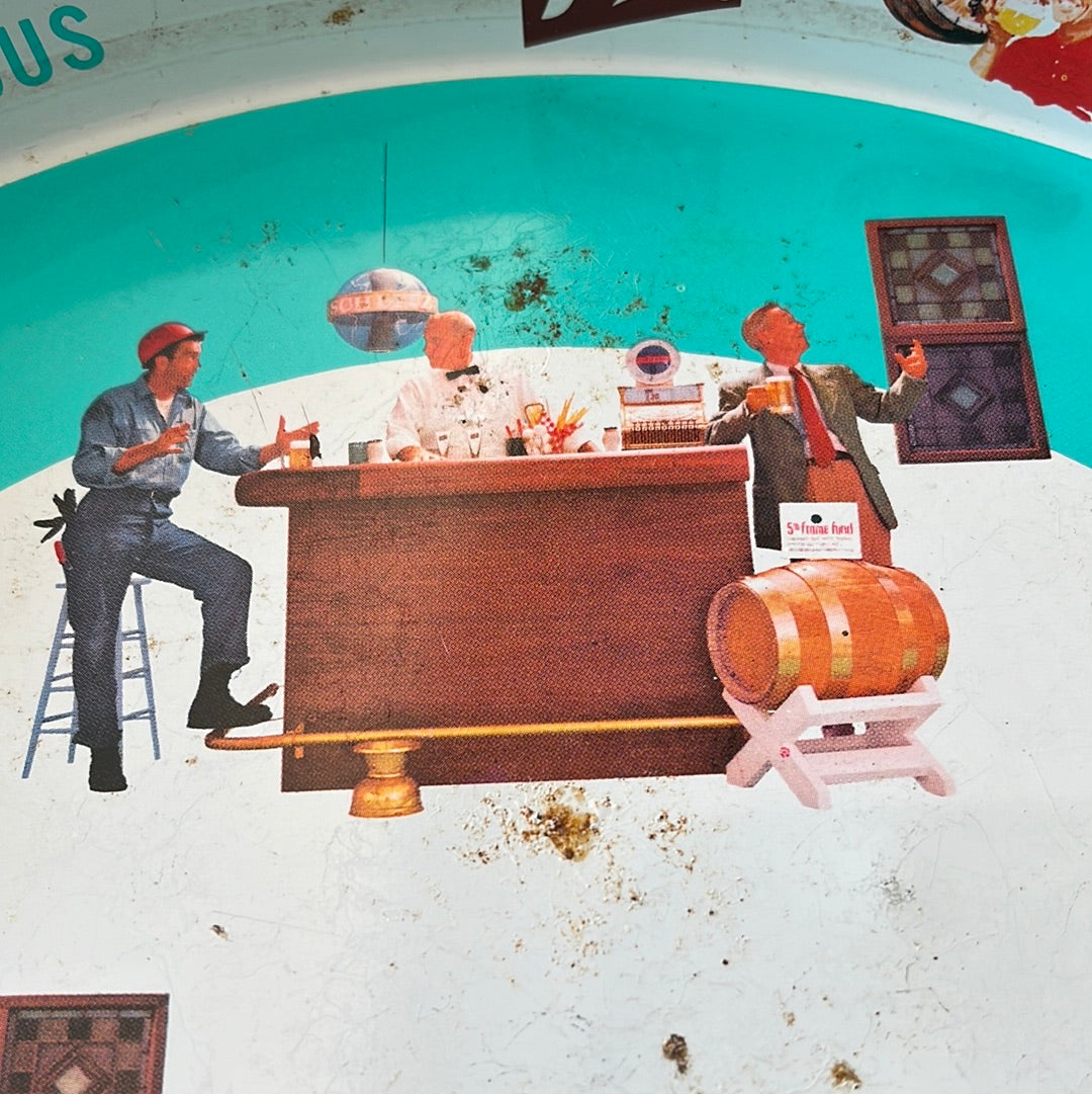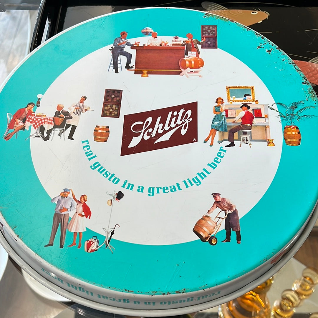 Round metal serving tray  with Schlitz logo.  Surface rust in spots.
