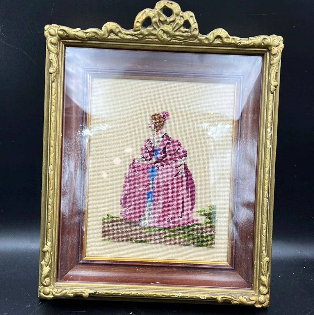 Ornate 9x7” Gold and Maroon frame with male and female couple cross stitched on ivory.