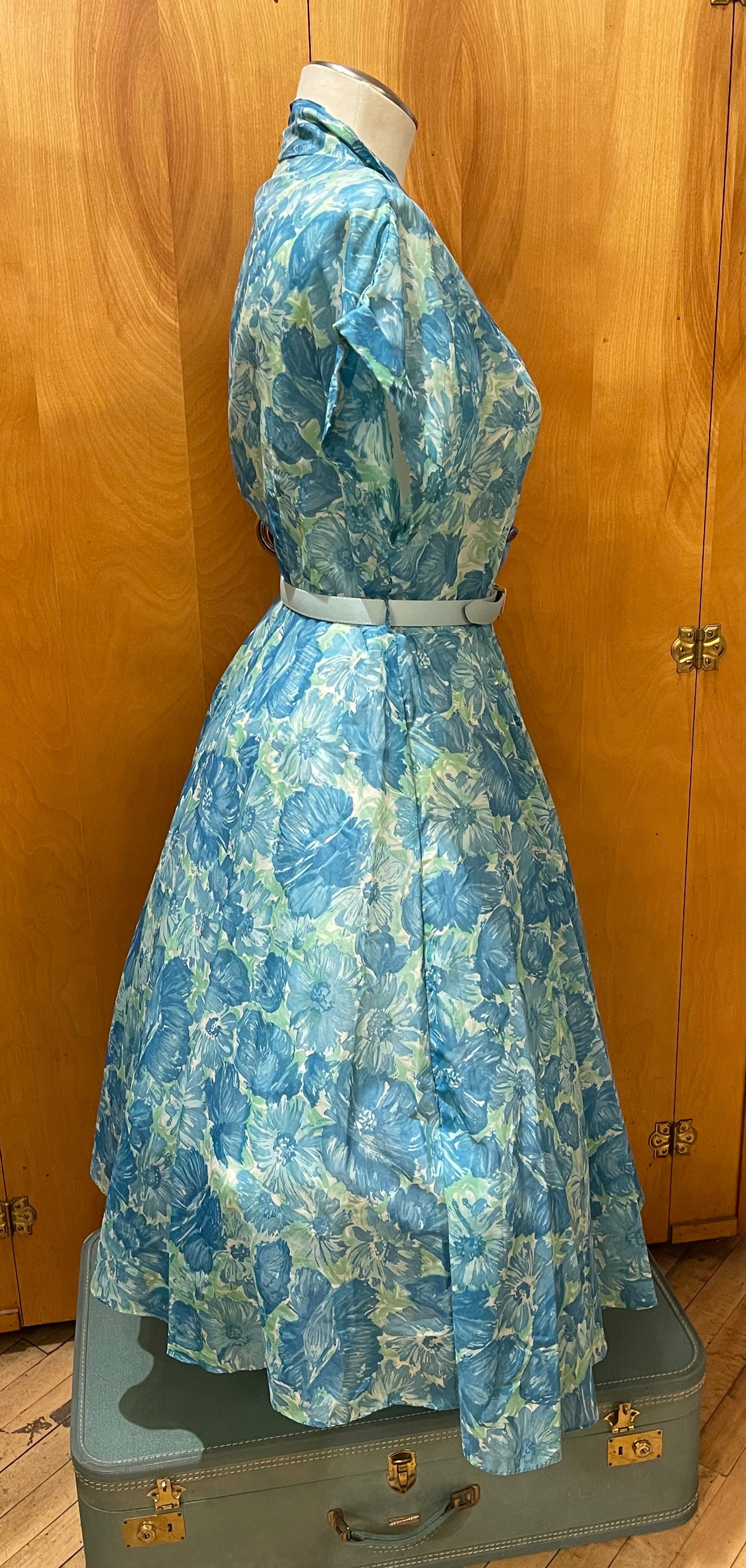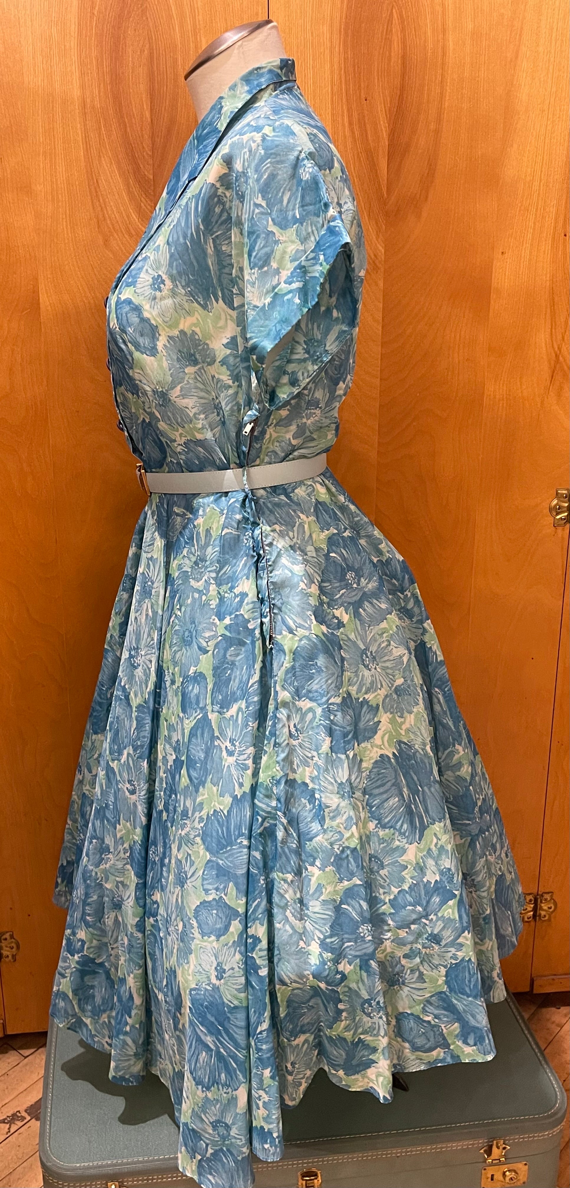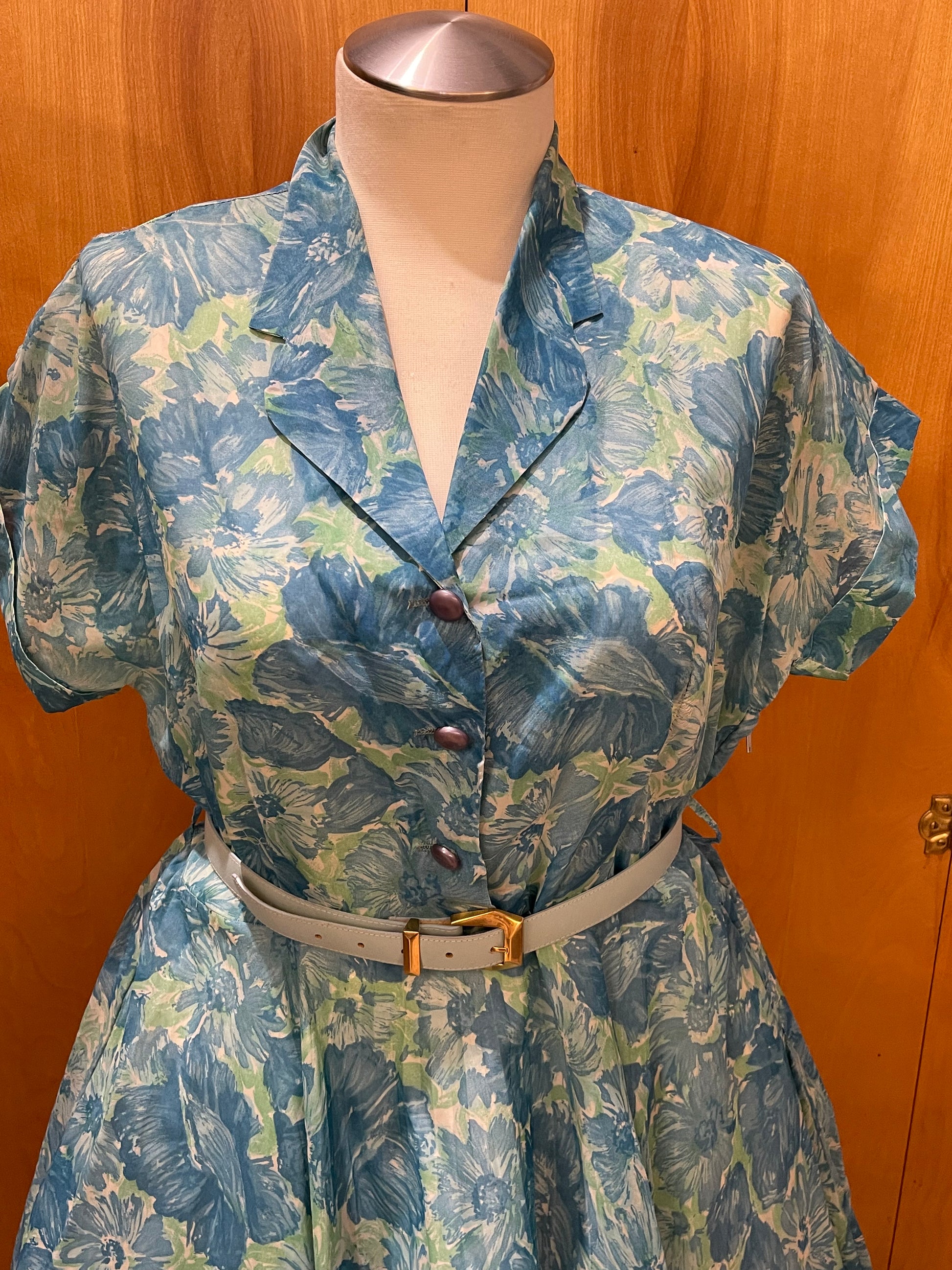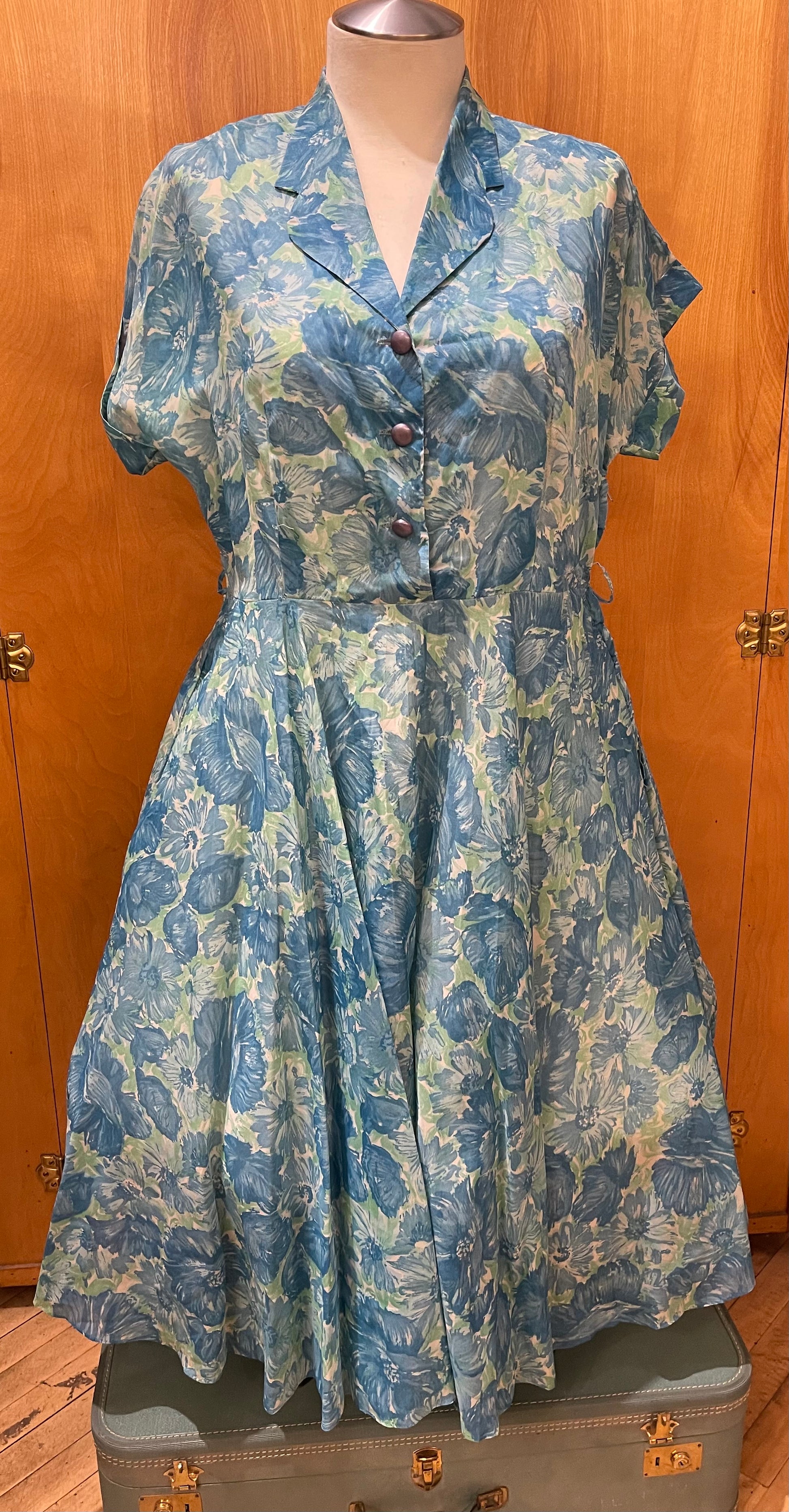 Get a retro look with our Sheer Blue Floral Dress! This 50s fit and flare style will flatter your figure with the convenience of a button bodice and side zipper. There is seam stress on the darts and if pinched in to hide this, the dress would still accommodate a size XXL.