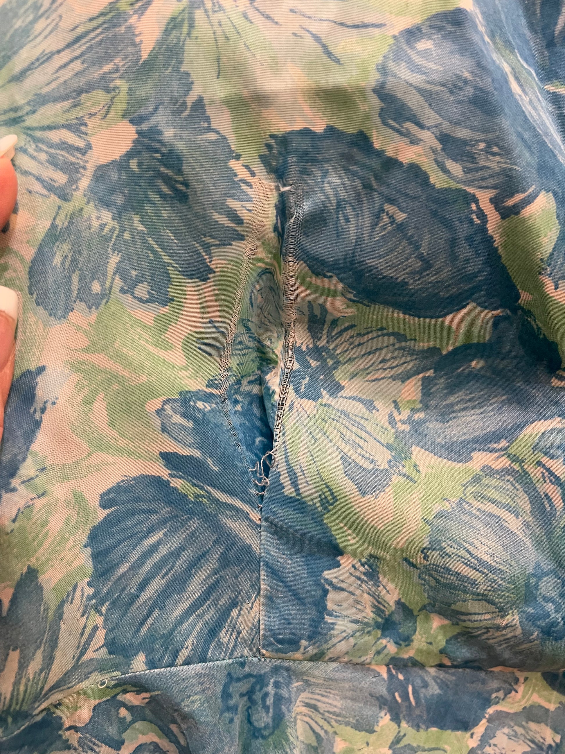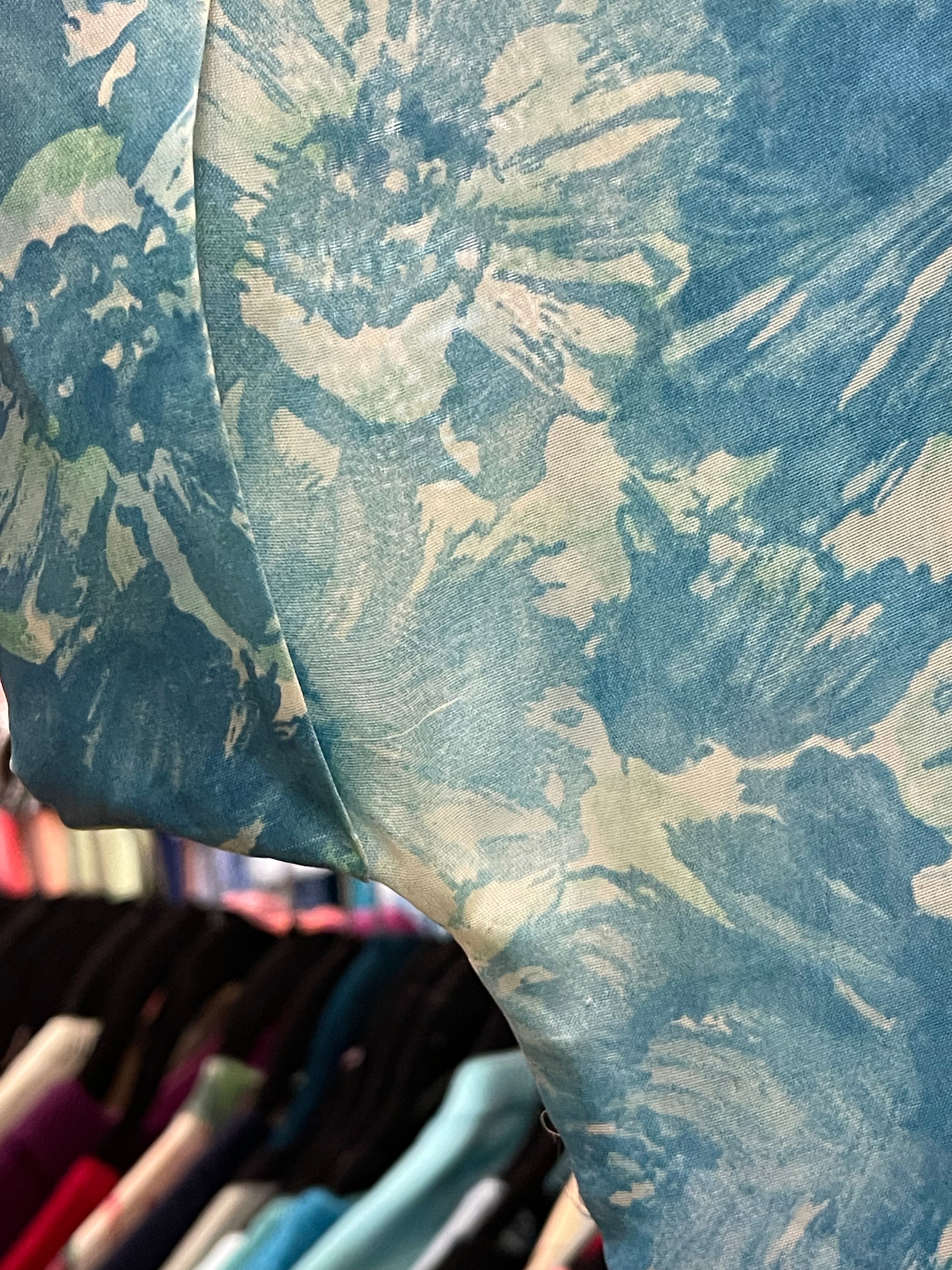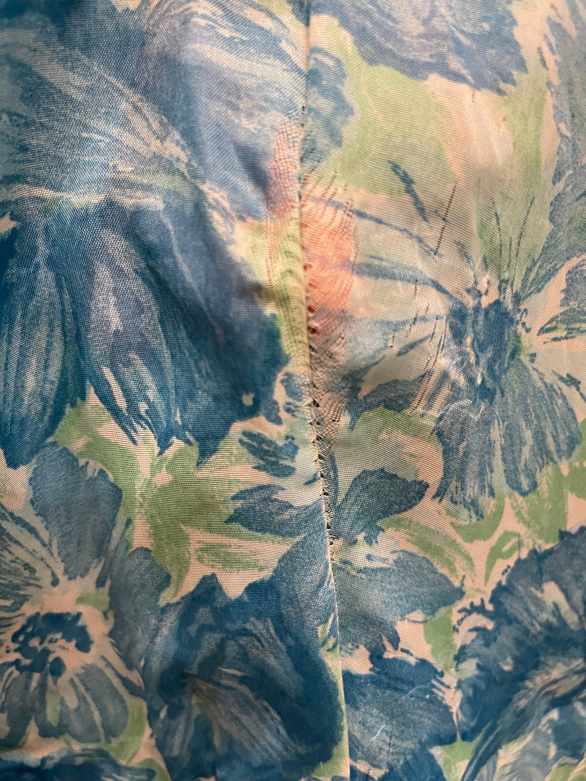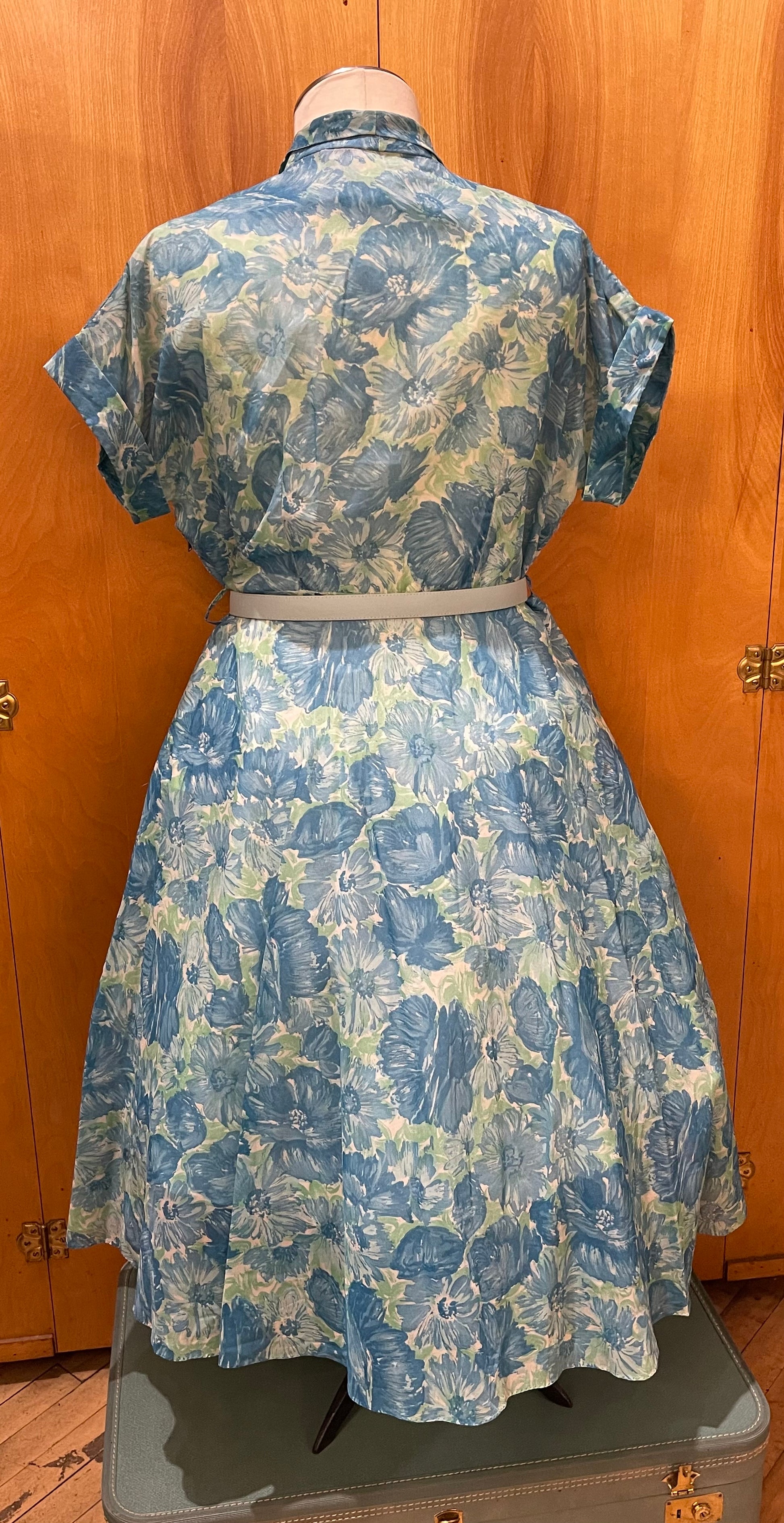 Get a retro look with our Sheer Blue Floral Dress! This 50s fit and flare style will flatter your figure with the convenience of a button bodice and side zipper. There is seam stress on the darts and if pinched in to hide this, the dress would still accommodate a size XXL.