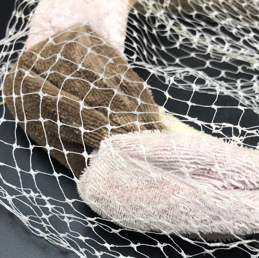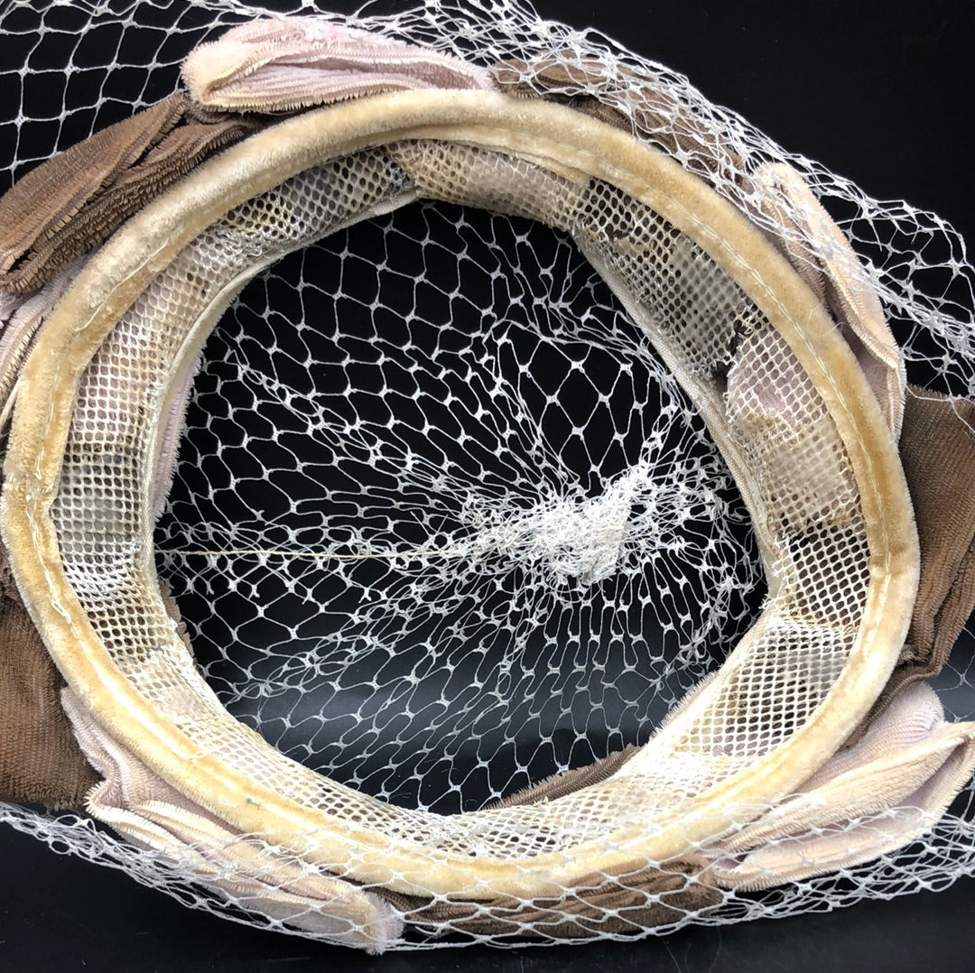 Loops of Taupe and Light Brown velvet alternate around the circle hat with a beige net that covers the entire hat.