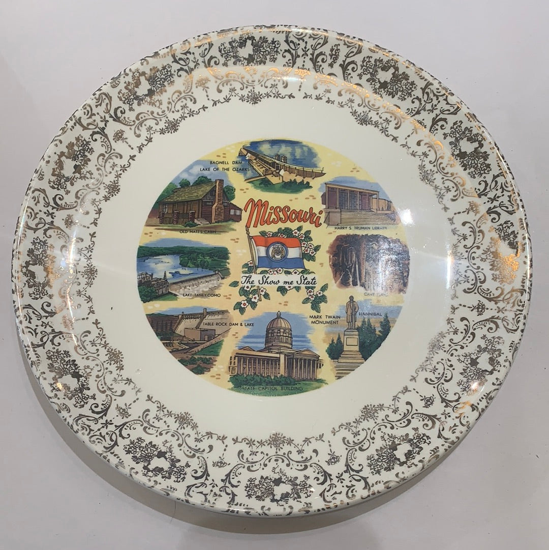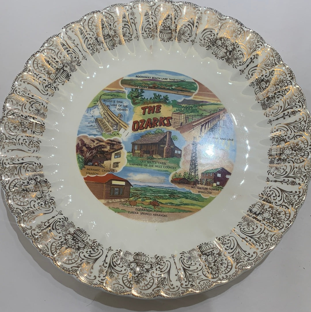 Ceramic decorative souvenir plate from the Ozarks, featuring Rockaway Beach lake, Taneycomo, old mats cabin Shepherd of the Hills country, and more .