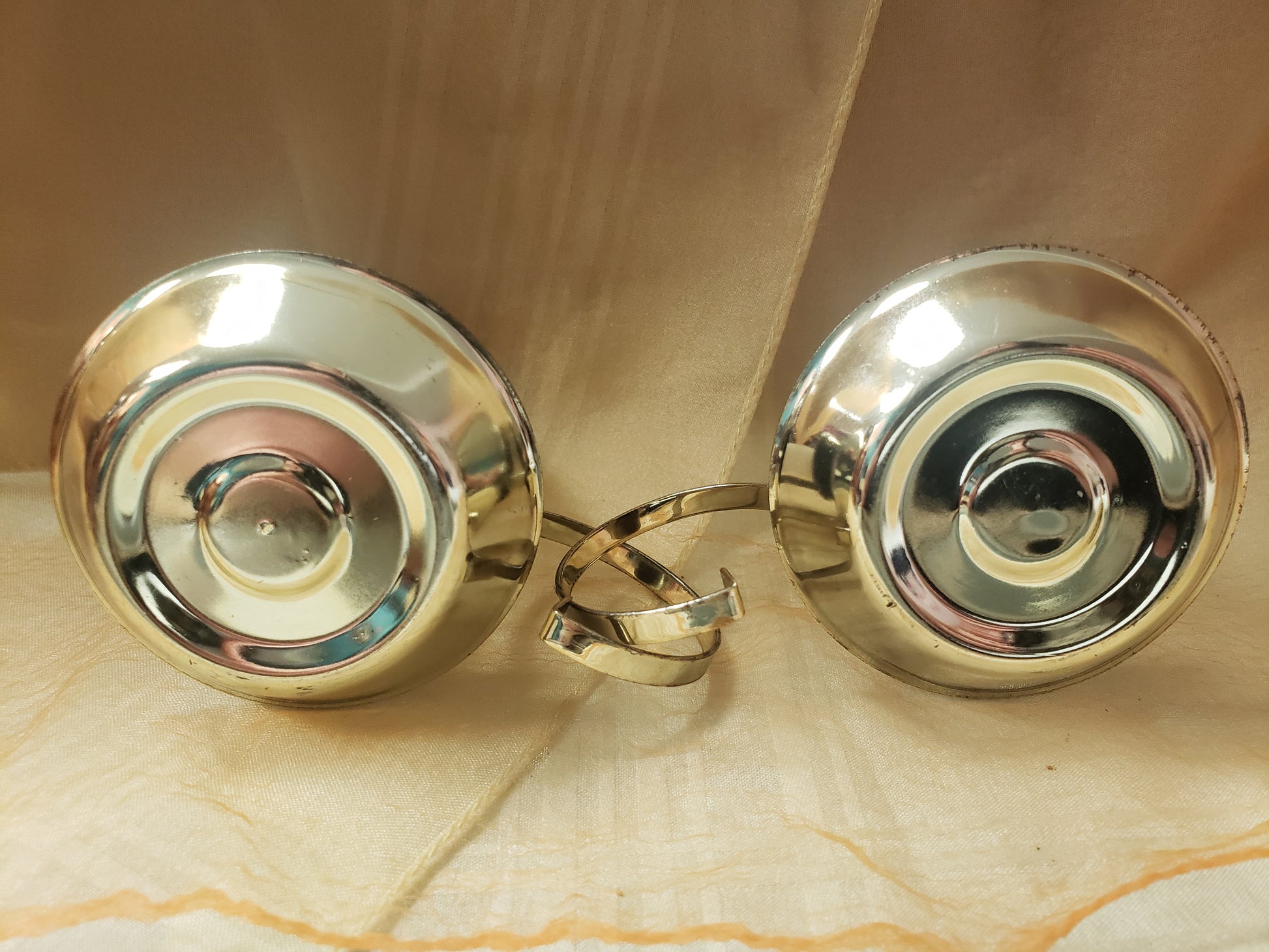 Very cute little candles with tin holders. The metal is a little tarnished but that only adds to the charm. Would be very cute with holly in the bowls. Also has a hole in the flame for hanging. Approximately 3 inches tall.
