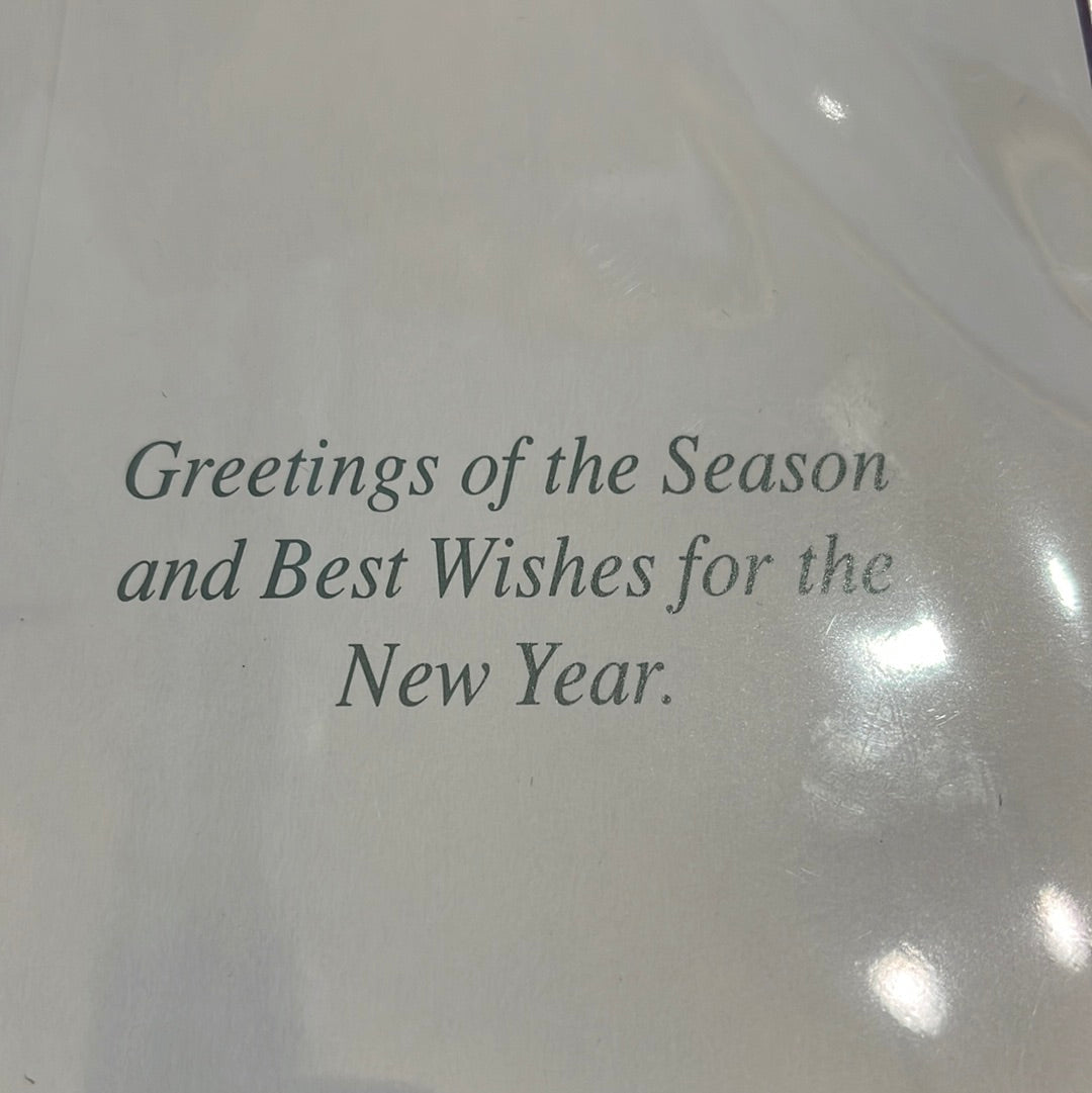 Outdoor decorated tree with wildlife and a message inside that reads “ Greetings of the Season and Best Wishes for the New Year”
