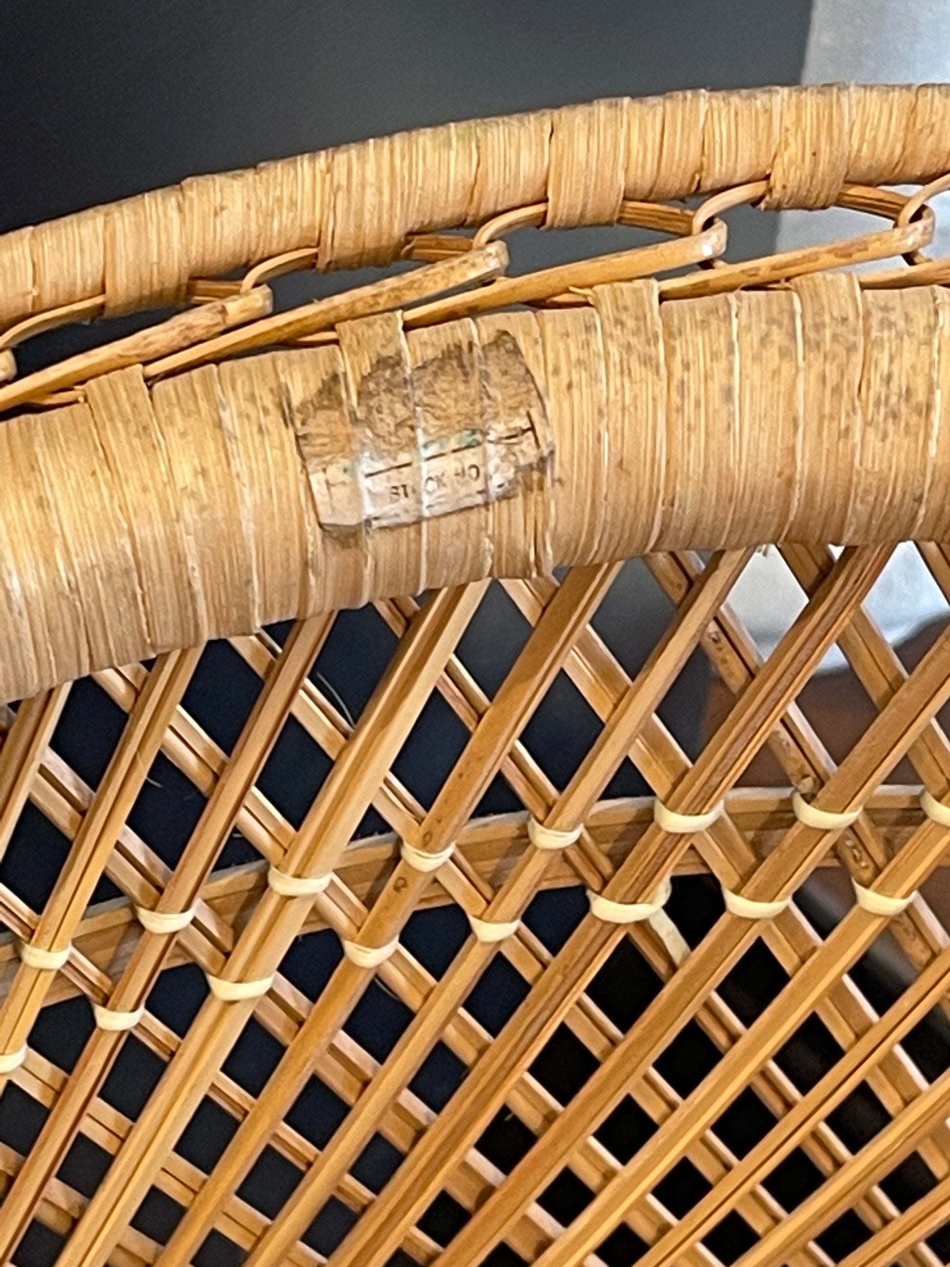 This is a cute little rattan barrel style chair in good condition. The arms and top edge are a bit dirty and there is sticker residue on the top edge but the rattan is in very good shape.