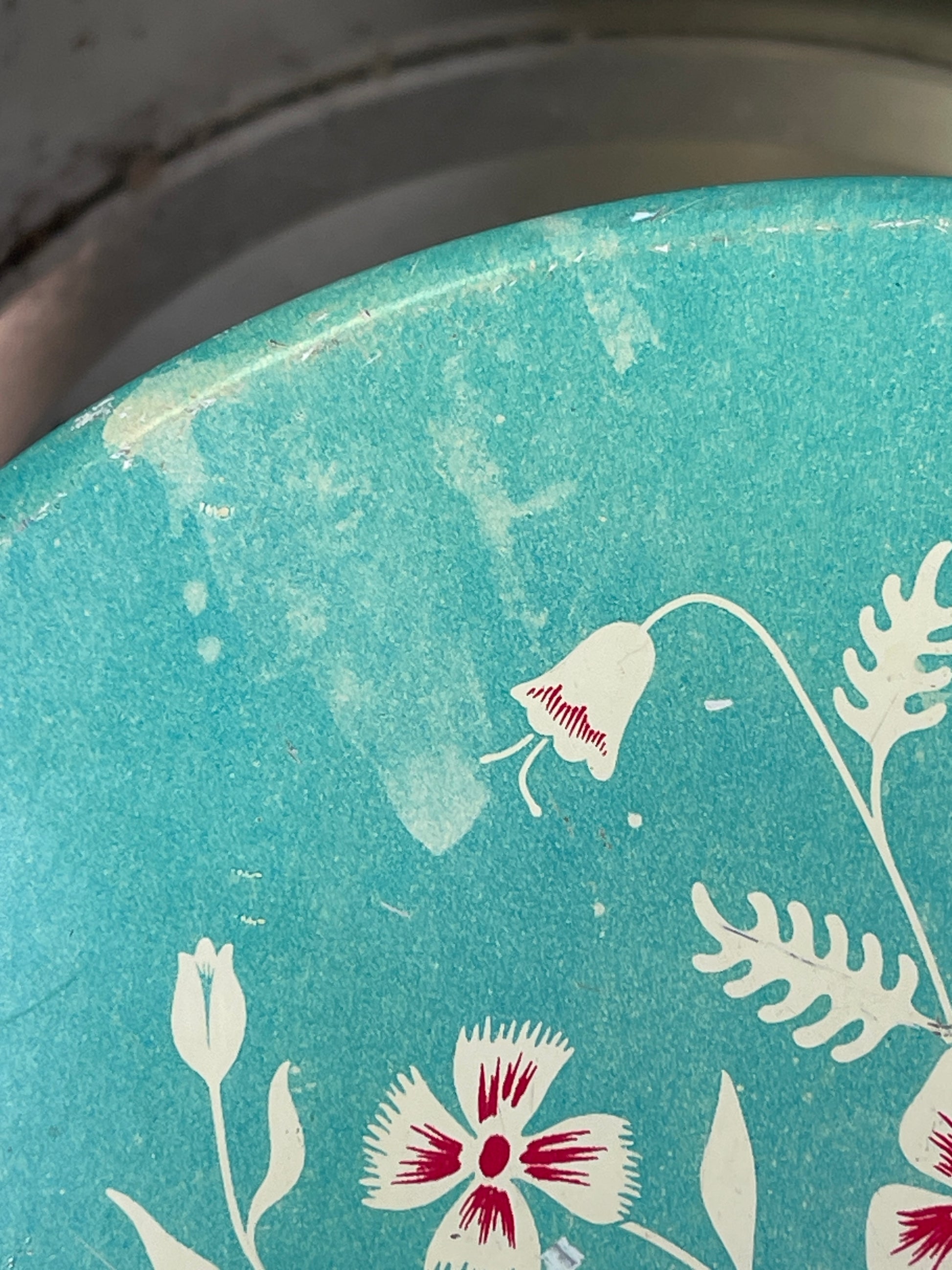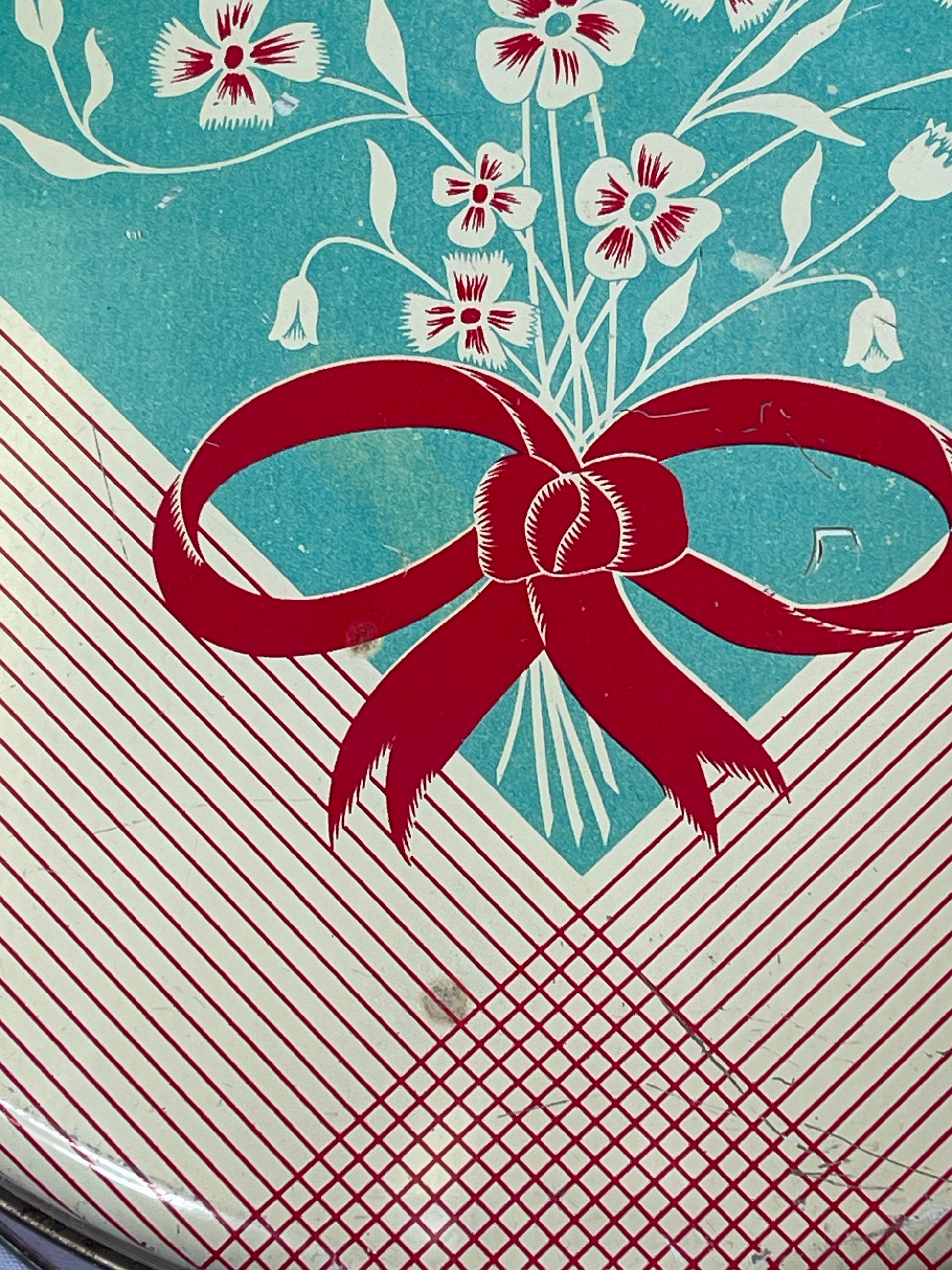 This vintage cookie tin boasts a beautiful 40s design, adding a touch of nostalgia to your kitchen. The minor dents and dings only add to its character, and even the one area of discoloration on the lid adds to its vintage charm. Perfect for storing treats or as a decorative piece.