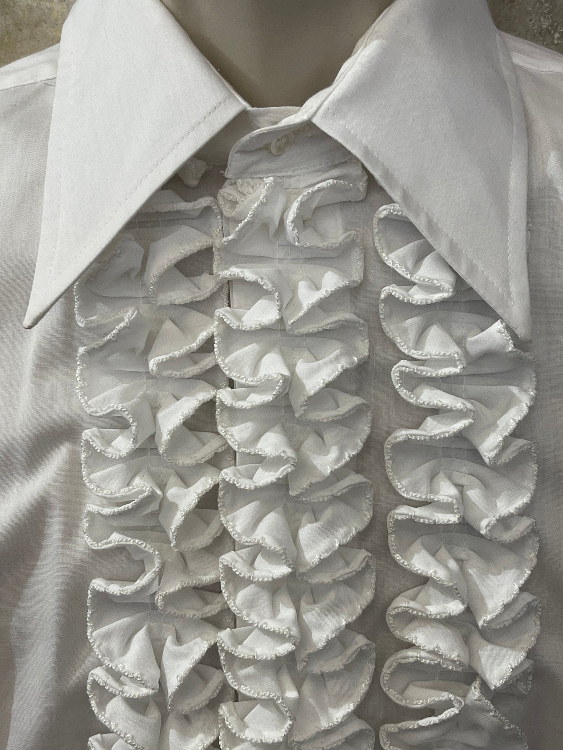 "Step back in time with this statement piece from the '70s. The Vintage Palm Beach Ruffle Tuxedo Shirt is a classic brand that adds a touch of whimsy to any outfit. Perfect for those who love to stand out in style!"