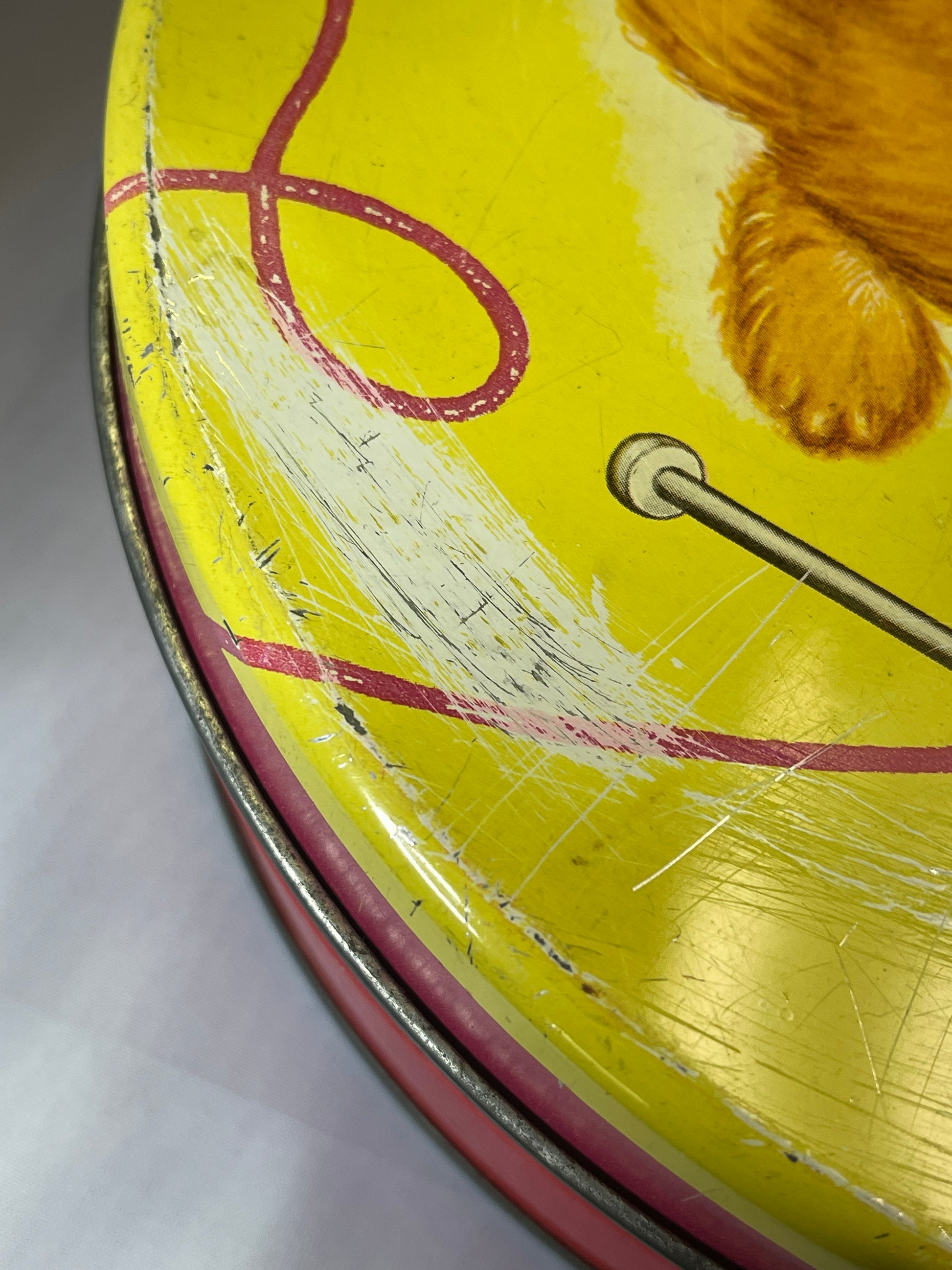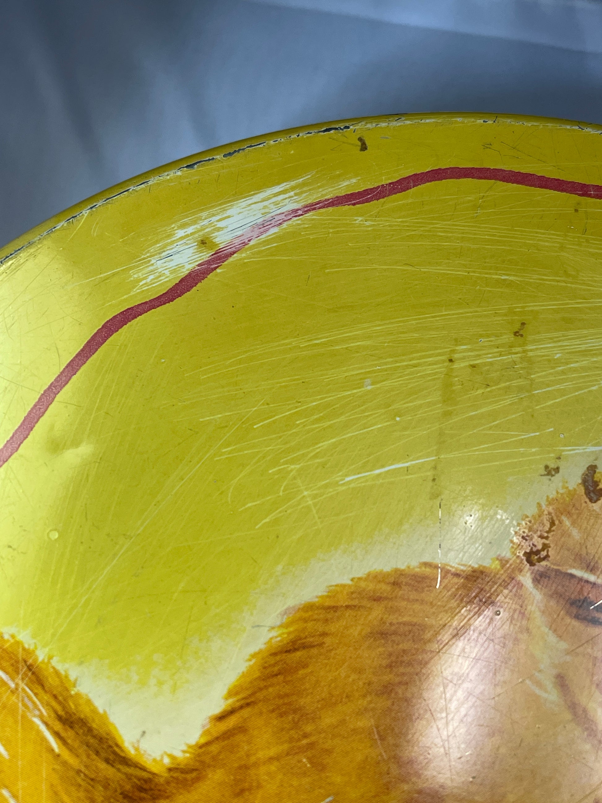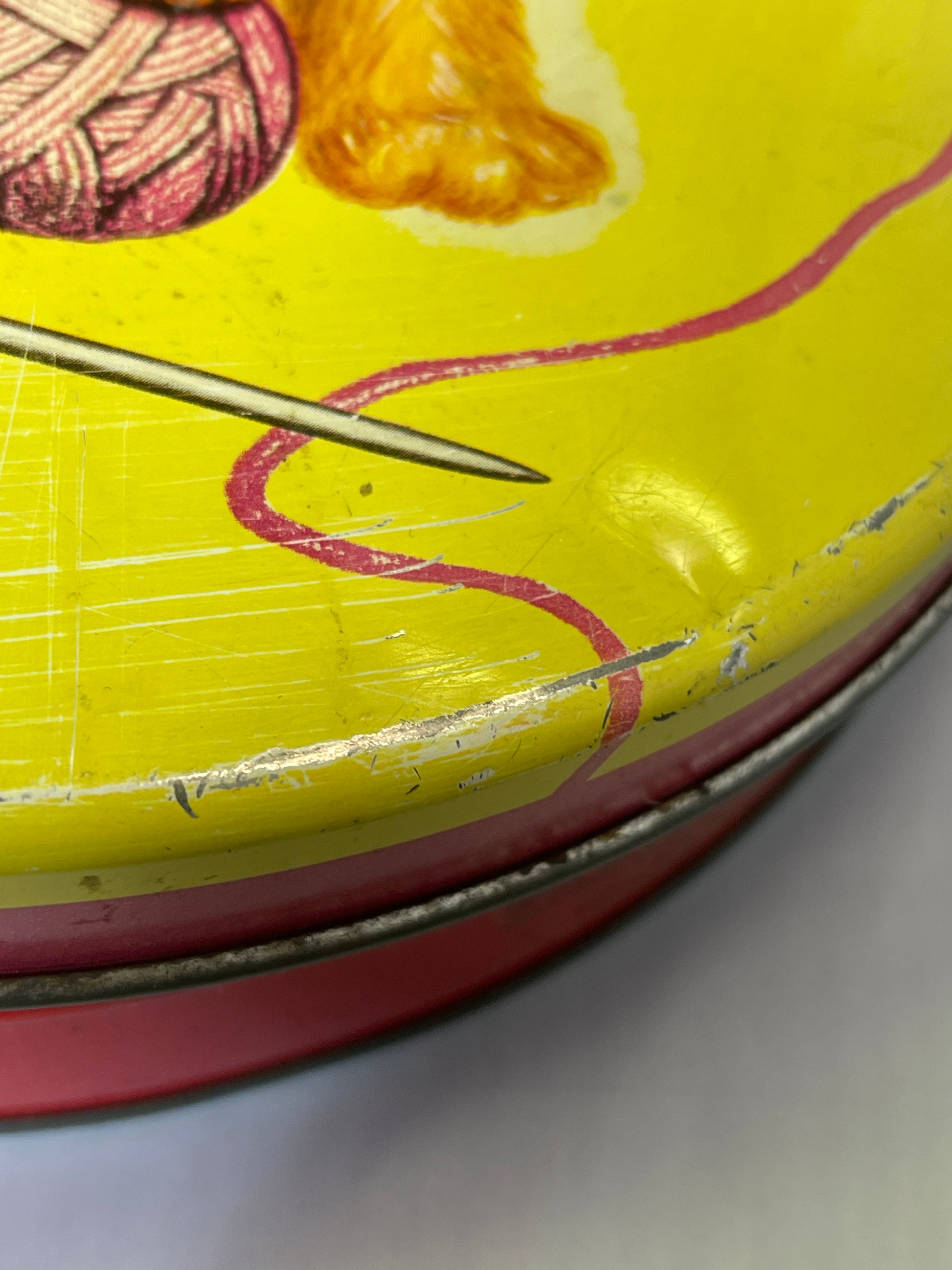 Get your paws on this playful addition to your collection! Our Vintage Playful Kitten Tin is the purr-fect storage solution with its bright yellow color and adorable kitten playing with yarn design. Don't fret over scratches, dents, or dings - they add to its charm (unlike your cat's mischievous antics). Meow or never, grab it today!