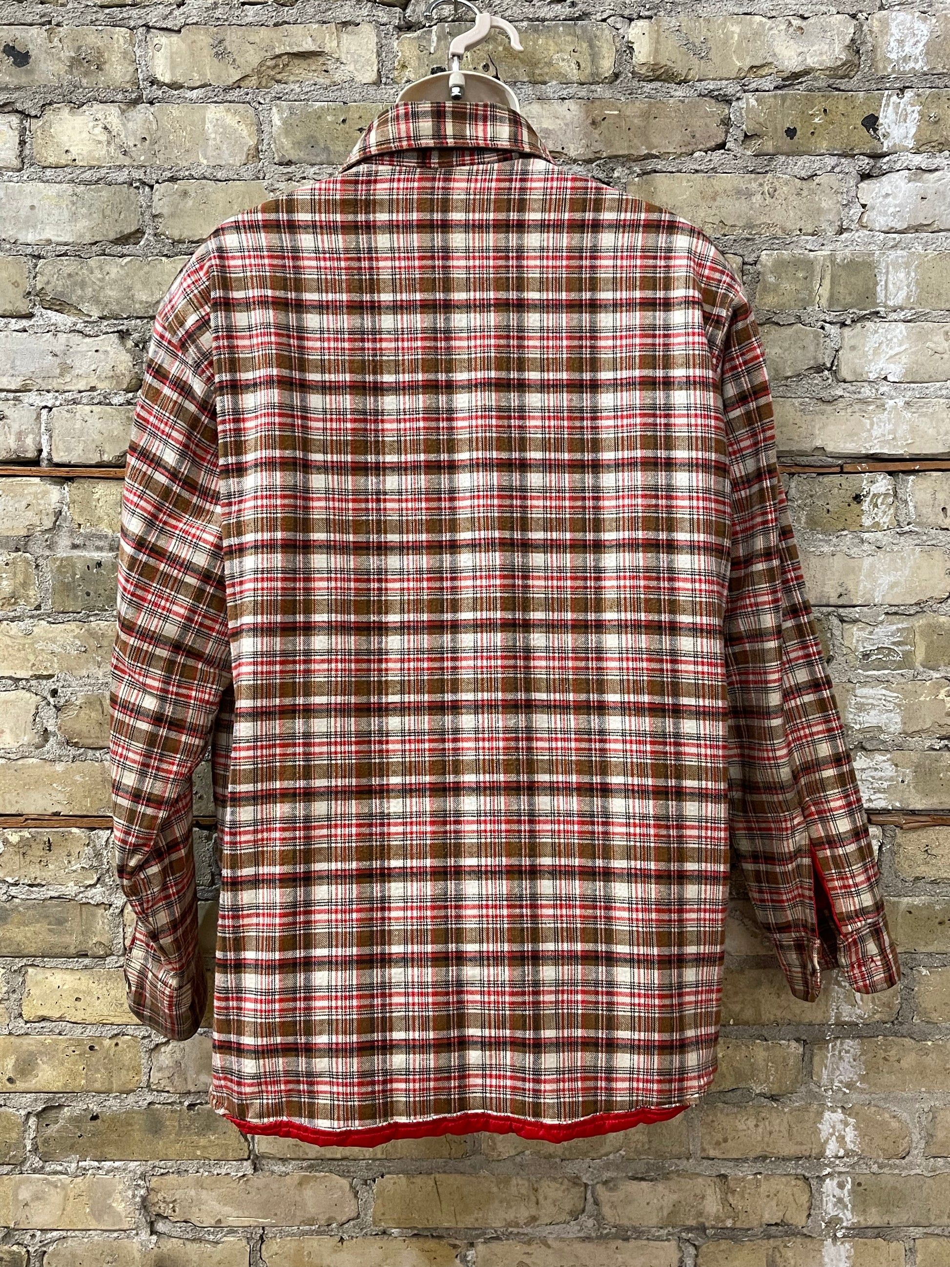 This classic vintage St John's Bay Quilted Flannel is an ideal piece for any wardrobe. Featuring a timeless black, brown, red, and ivory plaid pattern, a cozy red quilted lining, and a small, virtually unnoticeable stain on the front, this piece will add a unique yet timeless look to your style.