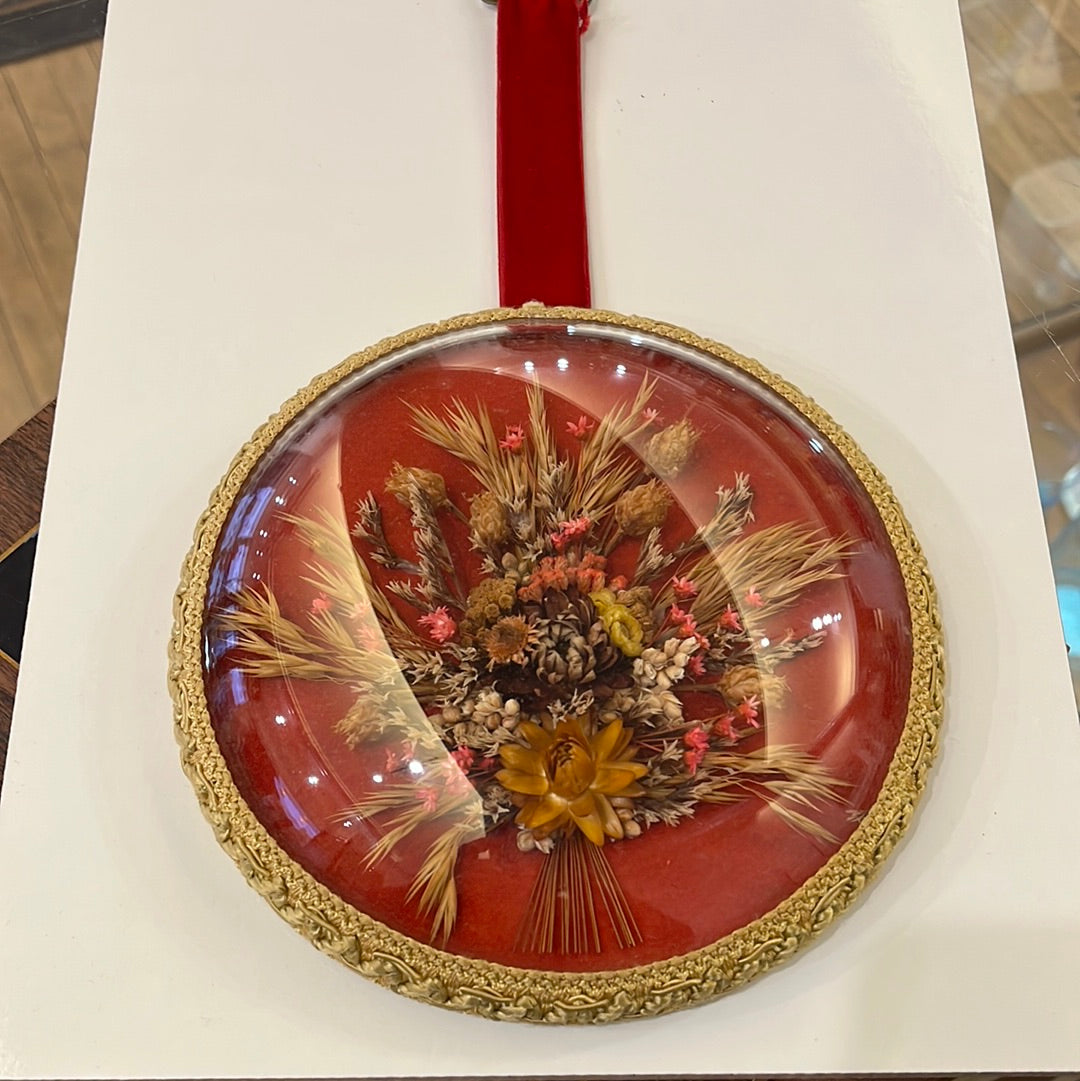 Dried flowers arranged over a red background with a woven edge. Round domed glass encloure with a a red velvet ribbon at the top to hang it. Handmade in Belgium.