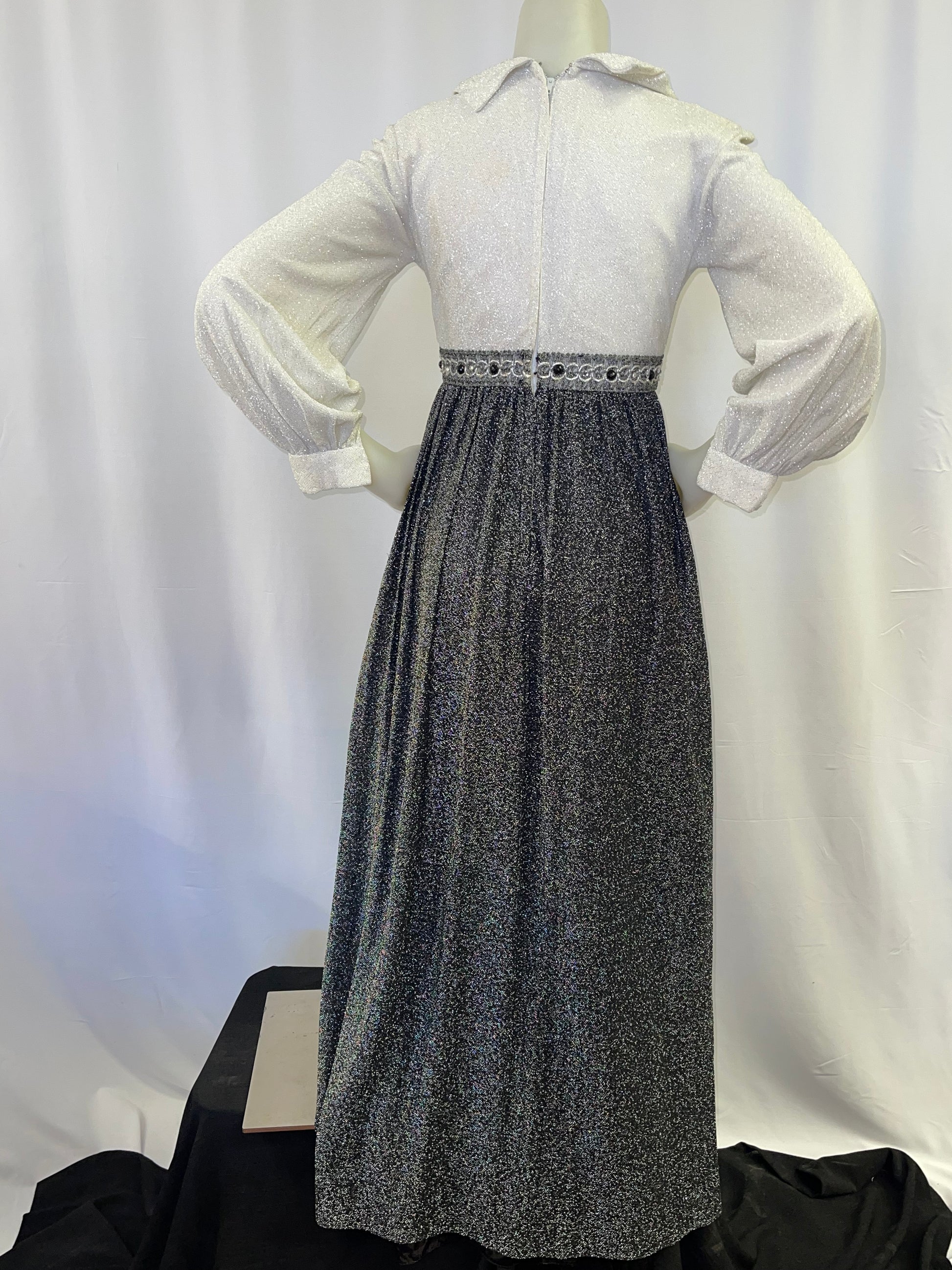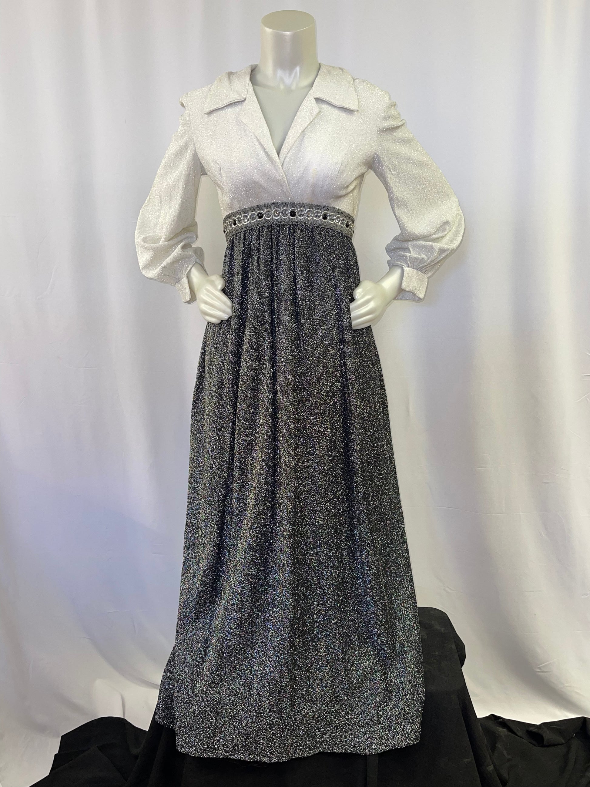 A beautiful, full sleeve, zip-up white and black dress covered in sparkles. The top half of the dress is white with a plunging v-neck neckline, and has some slight staining on the front. the bottom half of the dress skirt is black, with a jeweled waistline with ribbed patterns.
