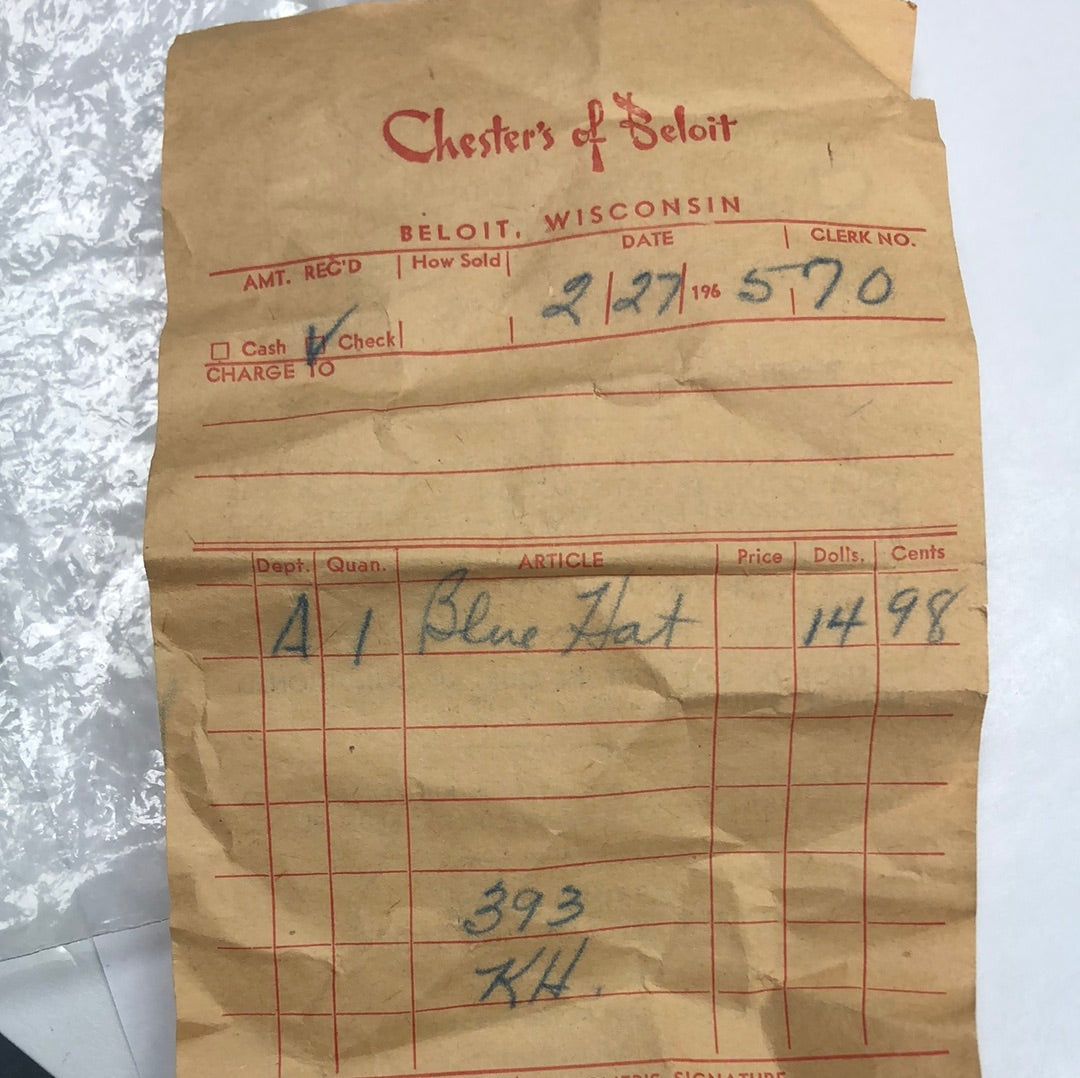White floral bucket hat with Powder Blue velvet rim and band.  Union made.  Original receipt attached from Chester's of Beloit for $14.98.
