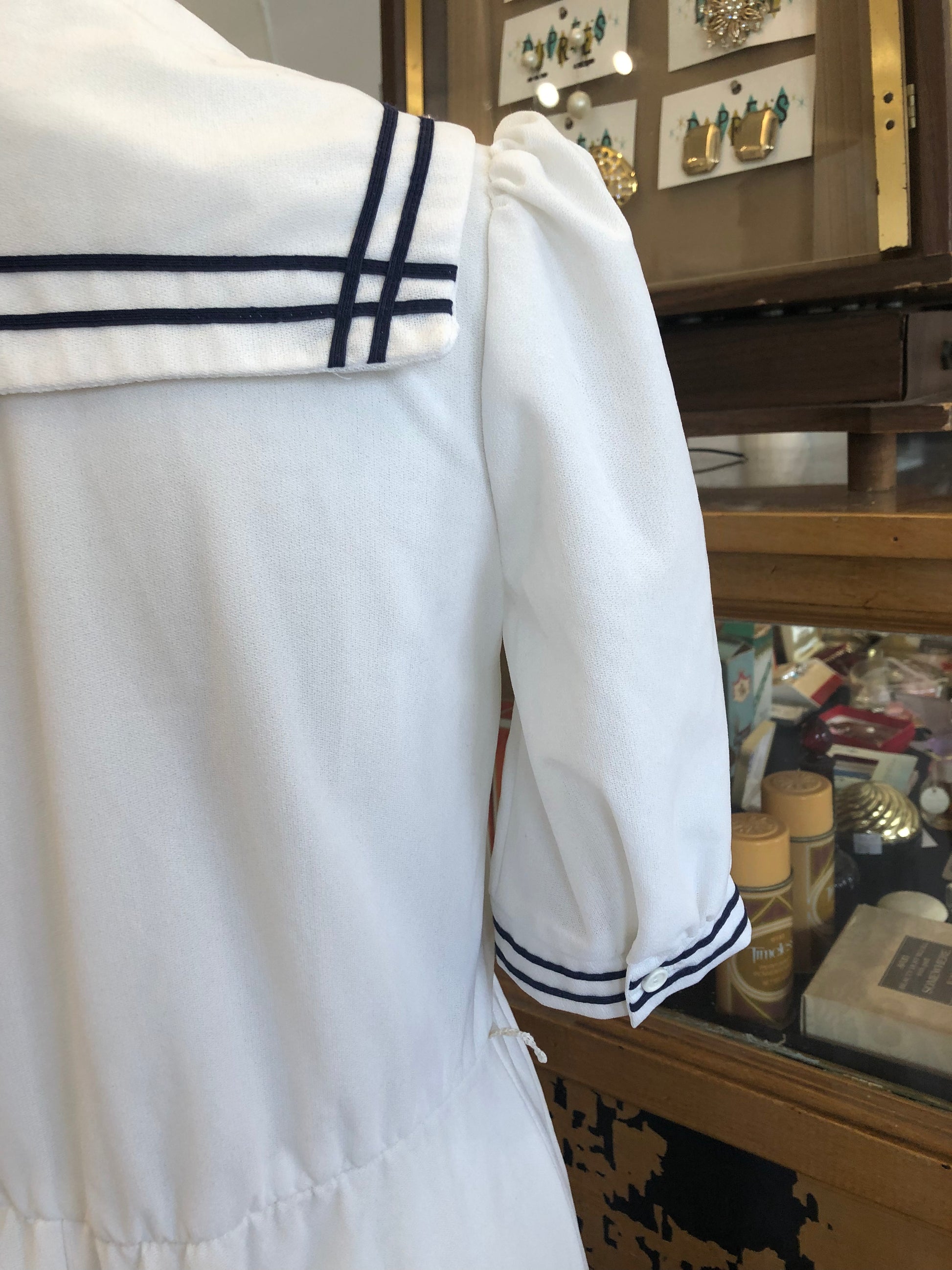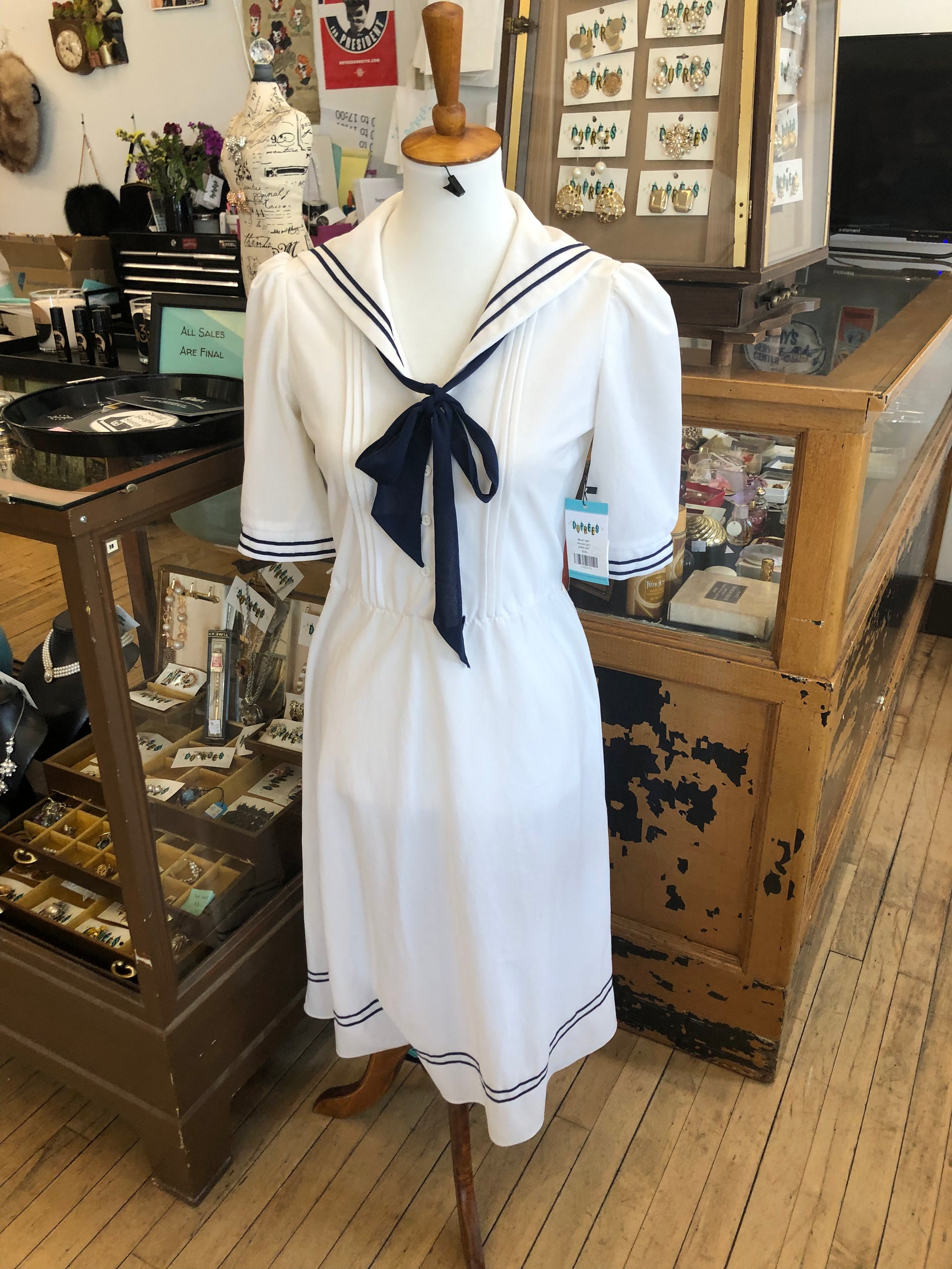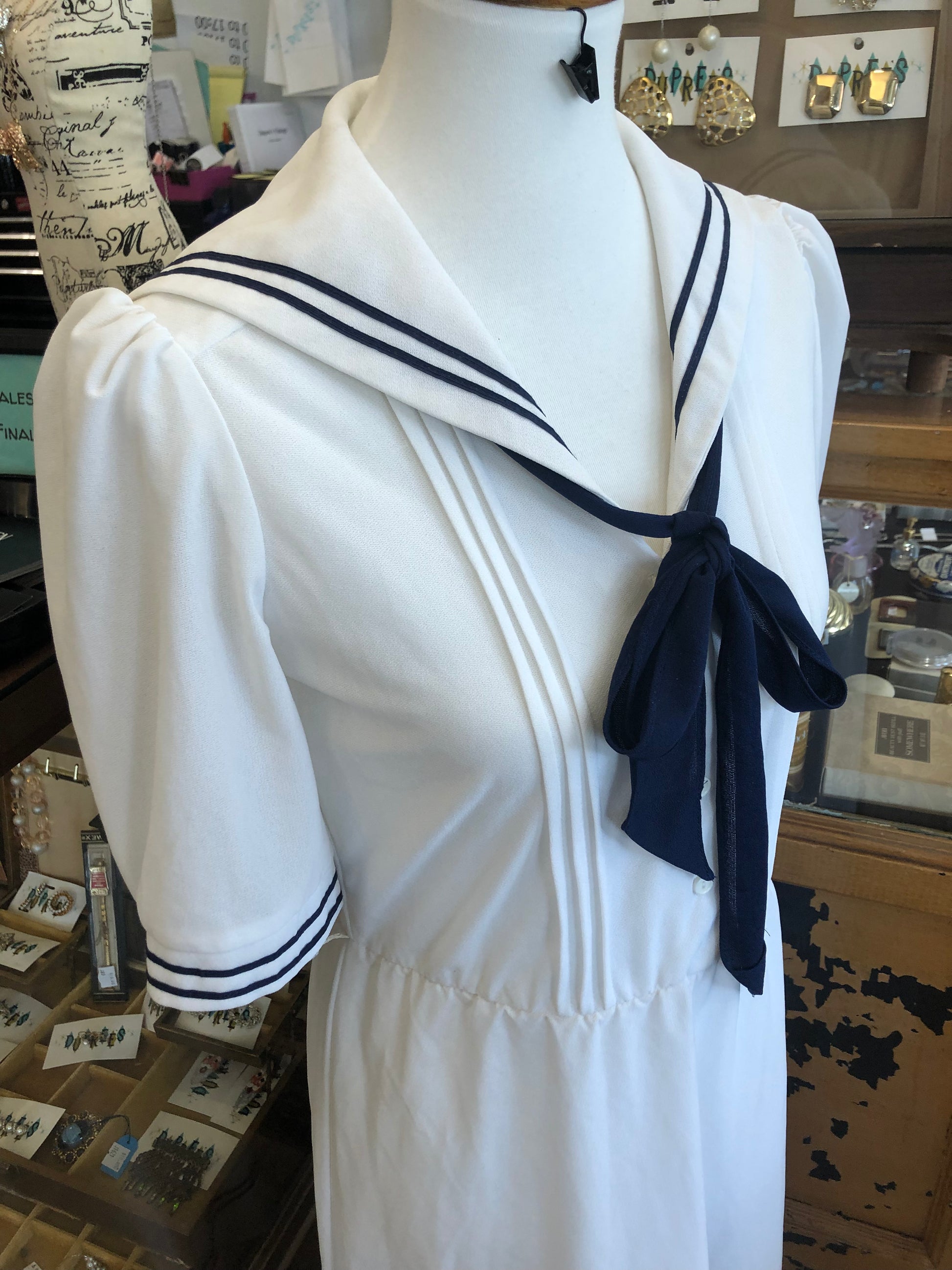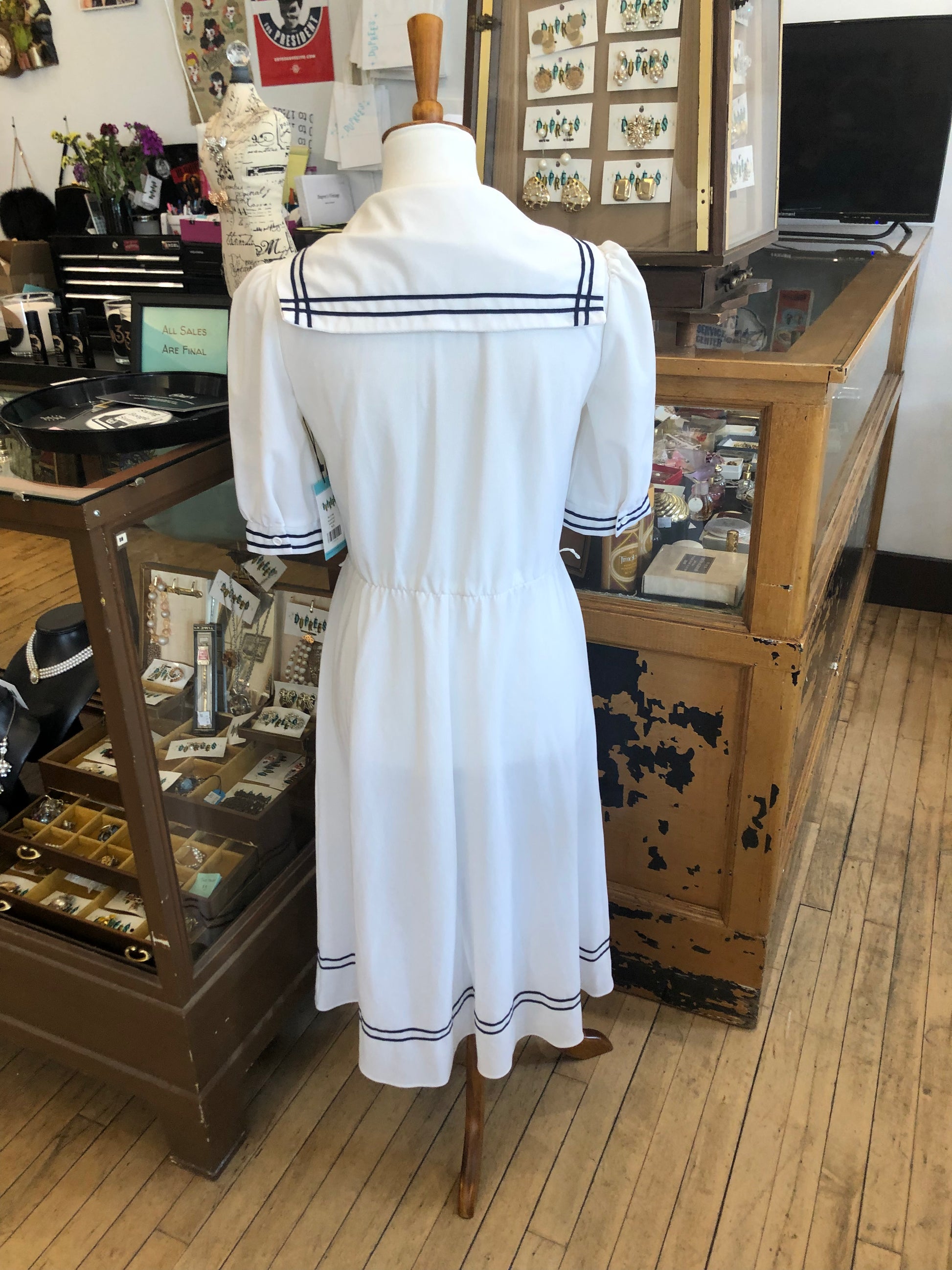 Sz 7/8 per tag, bust 36” , Waist 32”, Hips 40”. White Polyester nautical dress with Navy Blue trim. good condition. Missing belt.