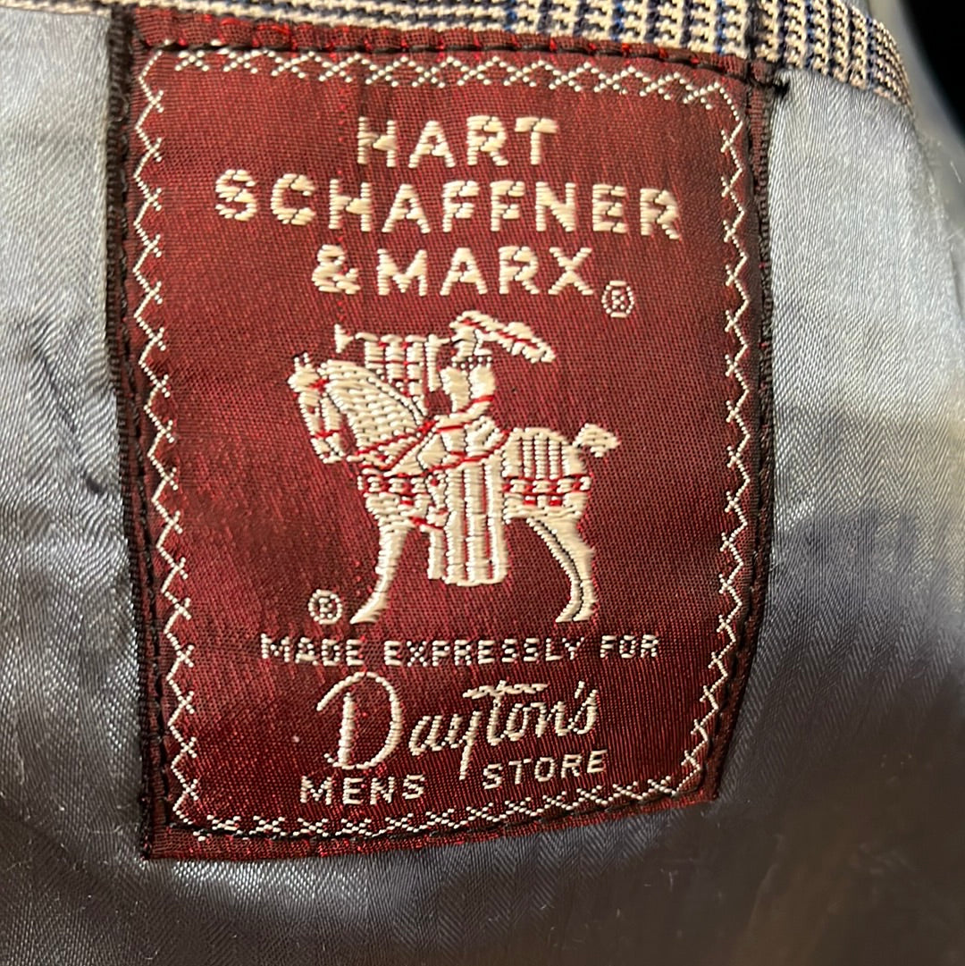 60’s Mens Black , White and Blue window pane 2 button blazer. Suit size 40, 44” chest. Hart Schaffner & Marx made expressly for Dayton’s mens store,