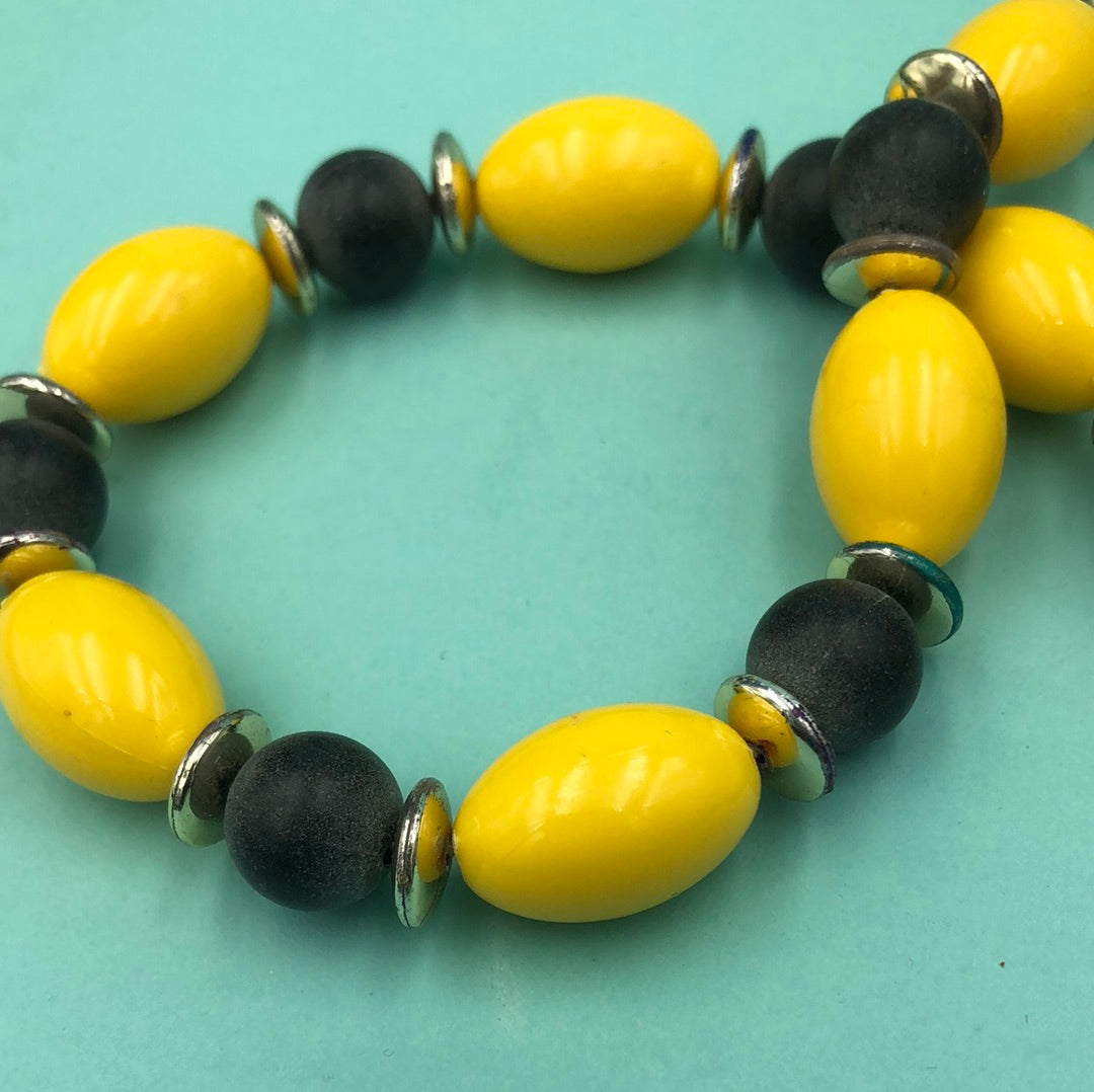 18" necklace with closure made up of round wooden black beads and oval yellow beads.  Silver/grey disc spacing beads.